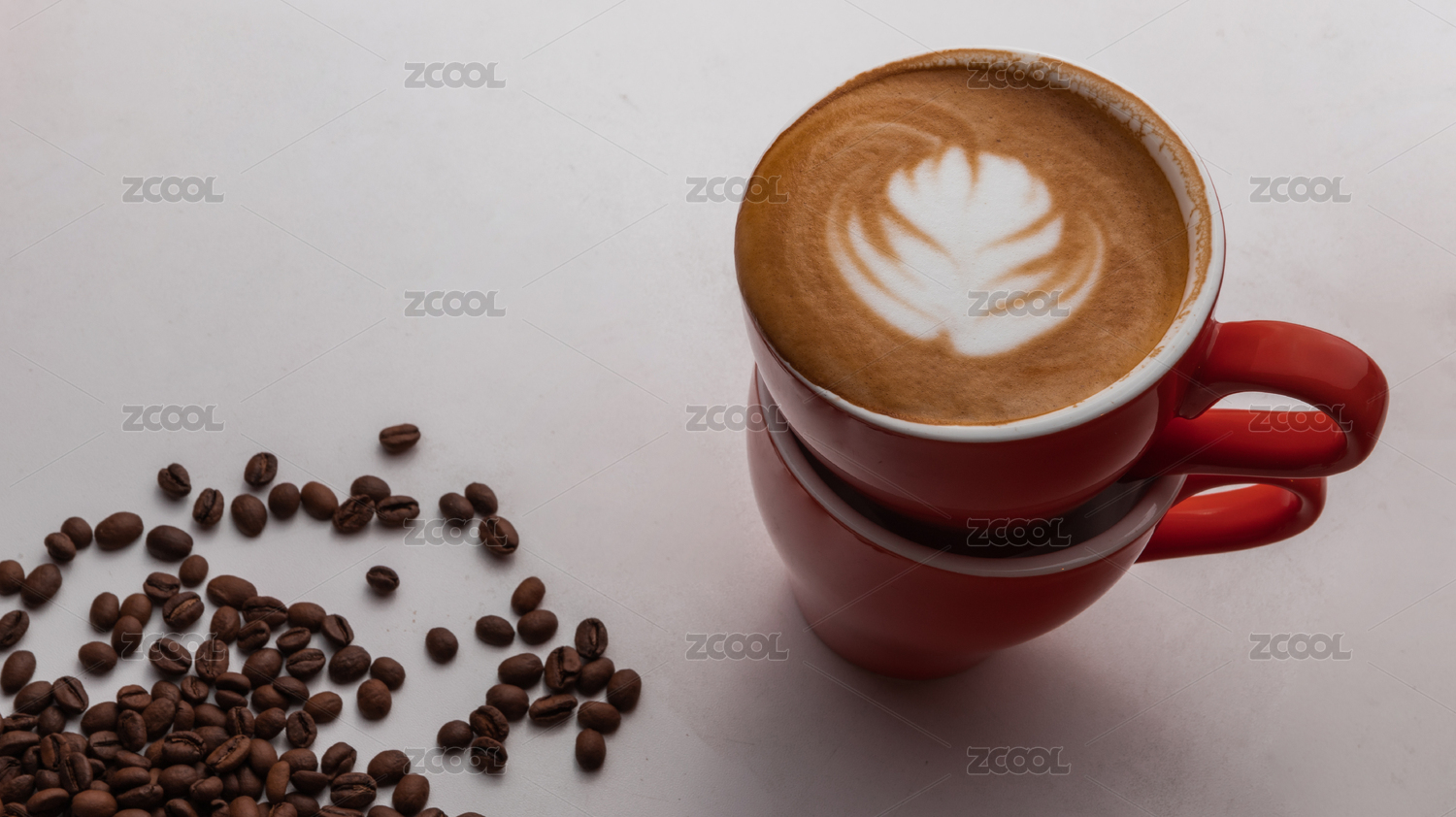 咖啡拿鐵拉花與烘焙咖啡豆的特寫