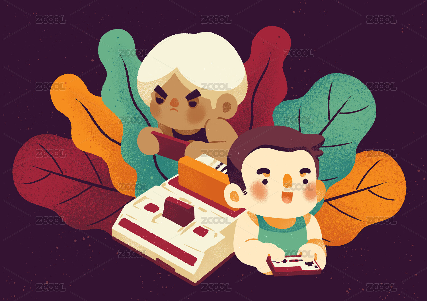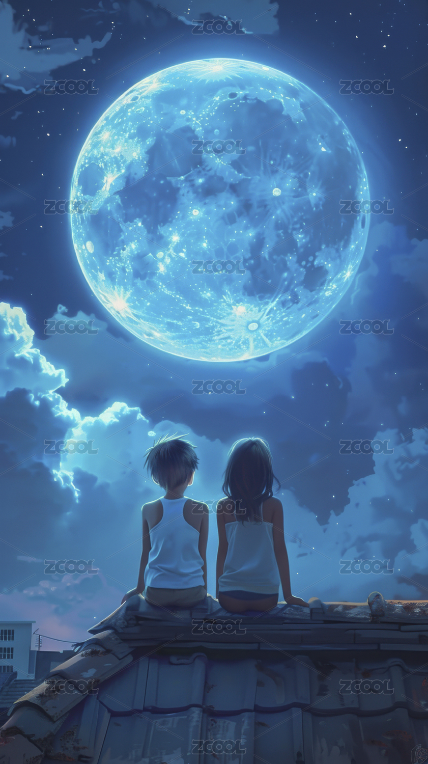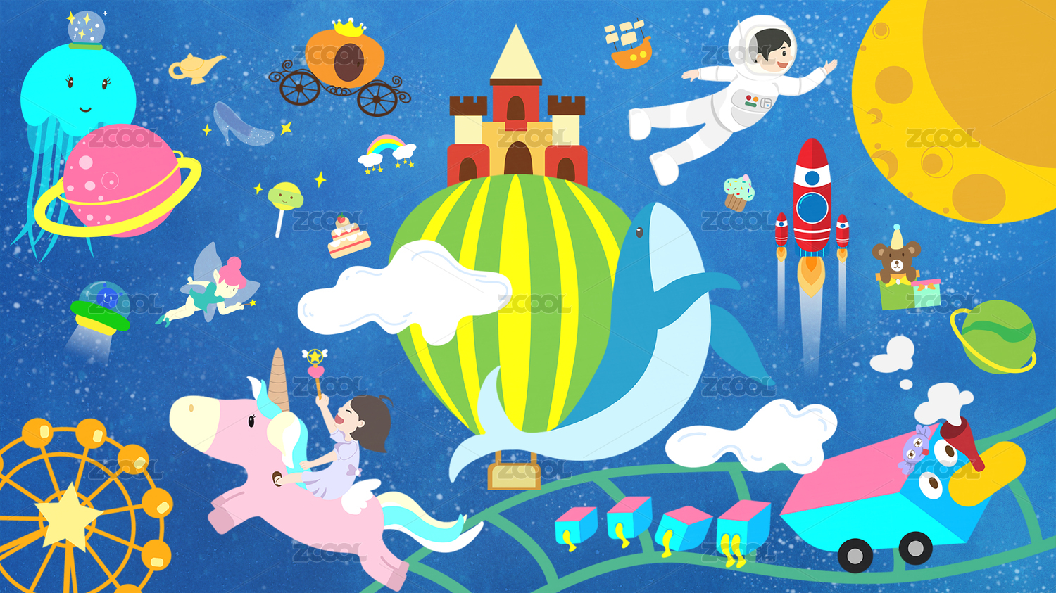 小女孩和小男孩與他們童年的玩具們在宇宙星河夢境里遨游,卡通夢幻童趣插畫