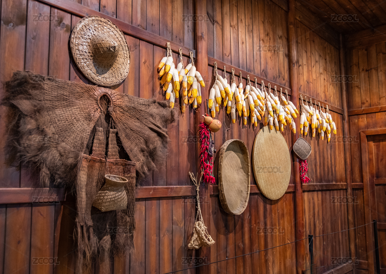 古老村落木墻上掛的農(nóng)具和農(nóng)作物