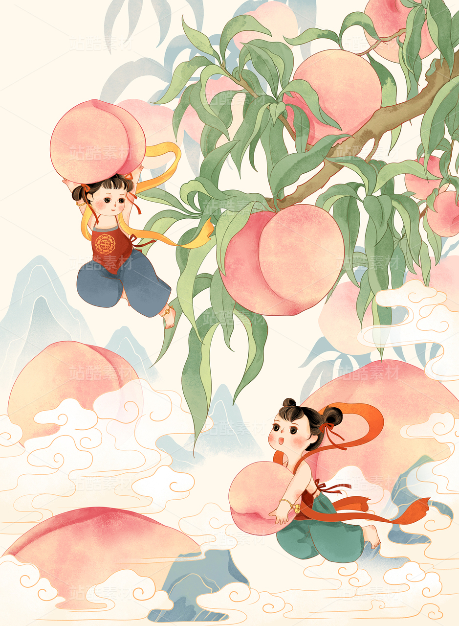 穿紅肚兜的可愛兒童與桃子祥云青山國潮水彩插畫