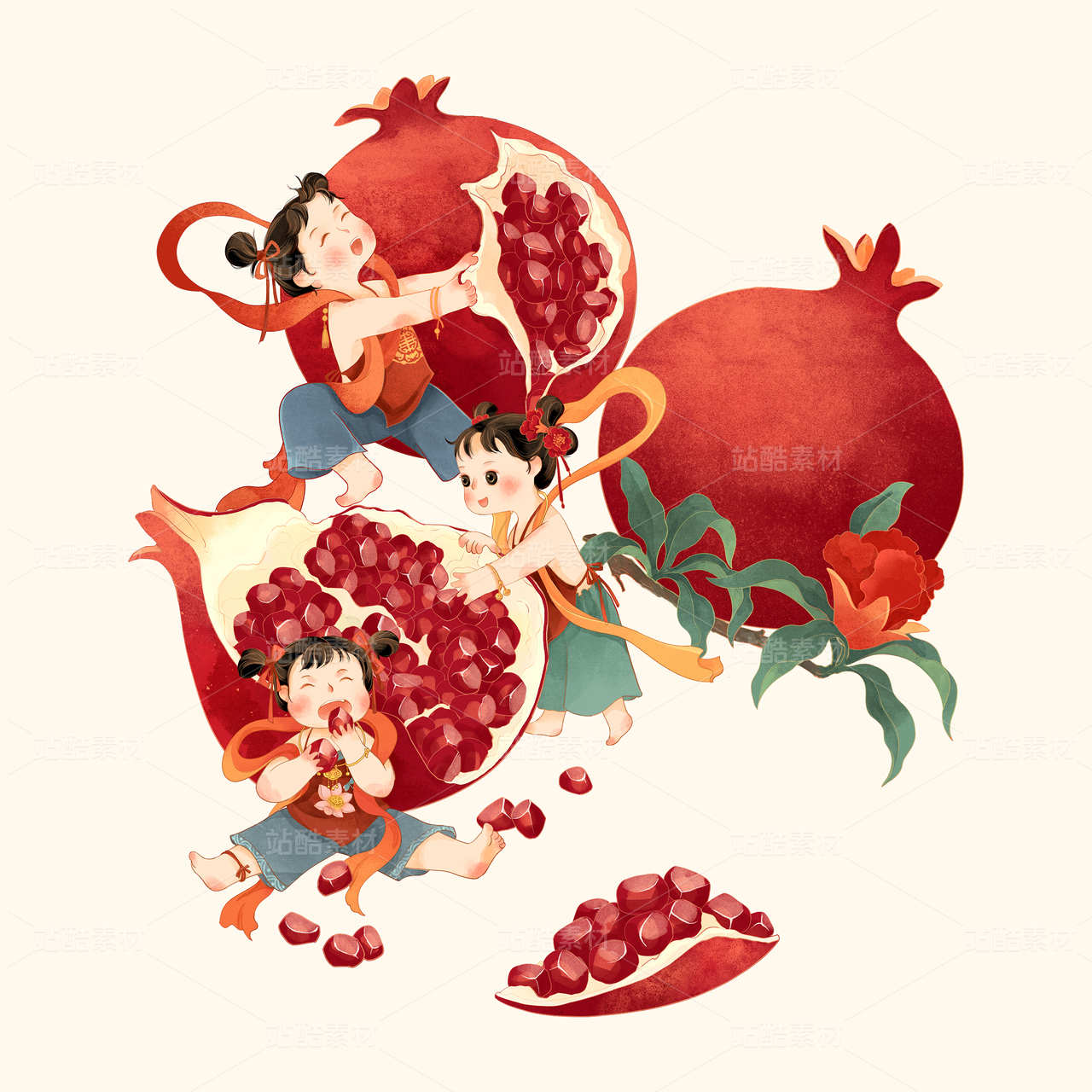 三個穿紅肚兜的可愛兒童與新鮮的石榴水果國潮插畫