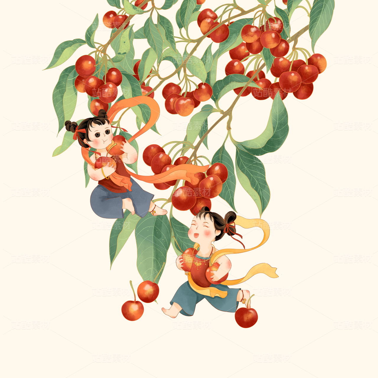兩個穿紅肚兜可愛小仙童摘櫻桃水果國潮插畫