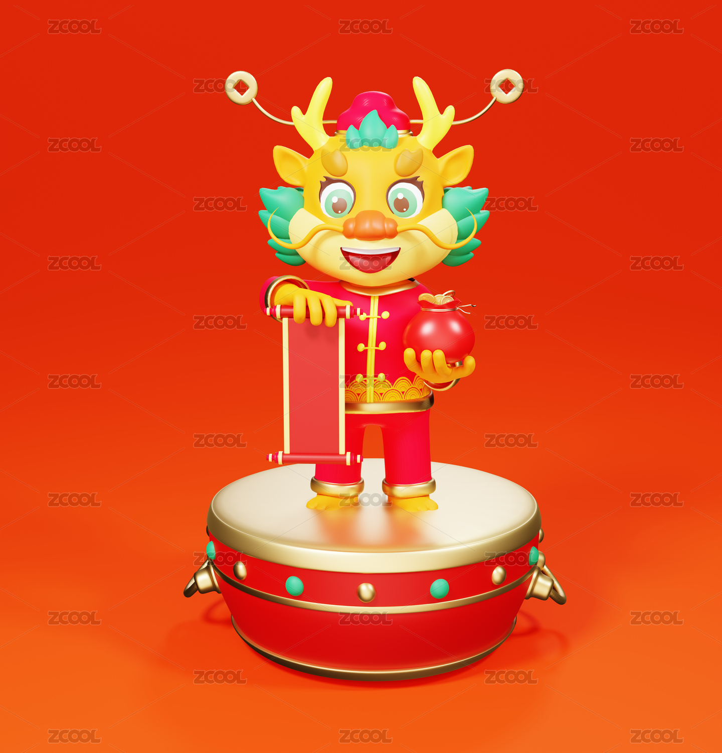 財(cái)神龍站在鑼鼓上手對(duì)聯(lián)和錢袋三維插畫