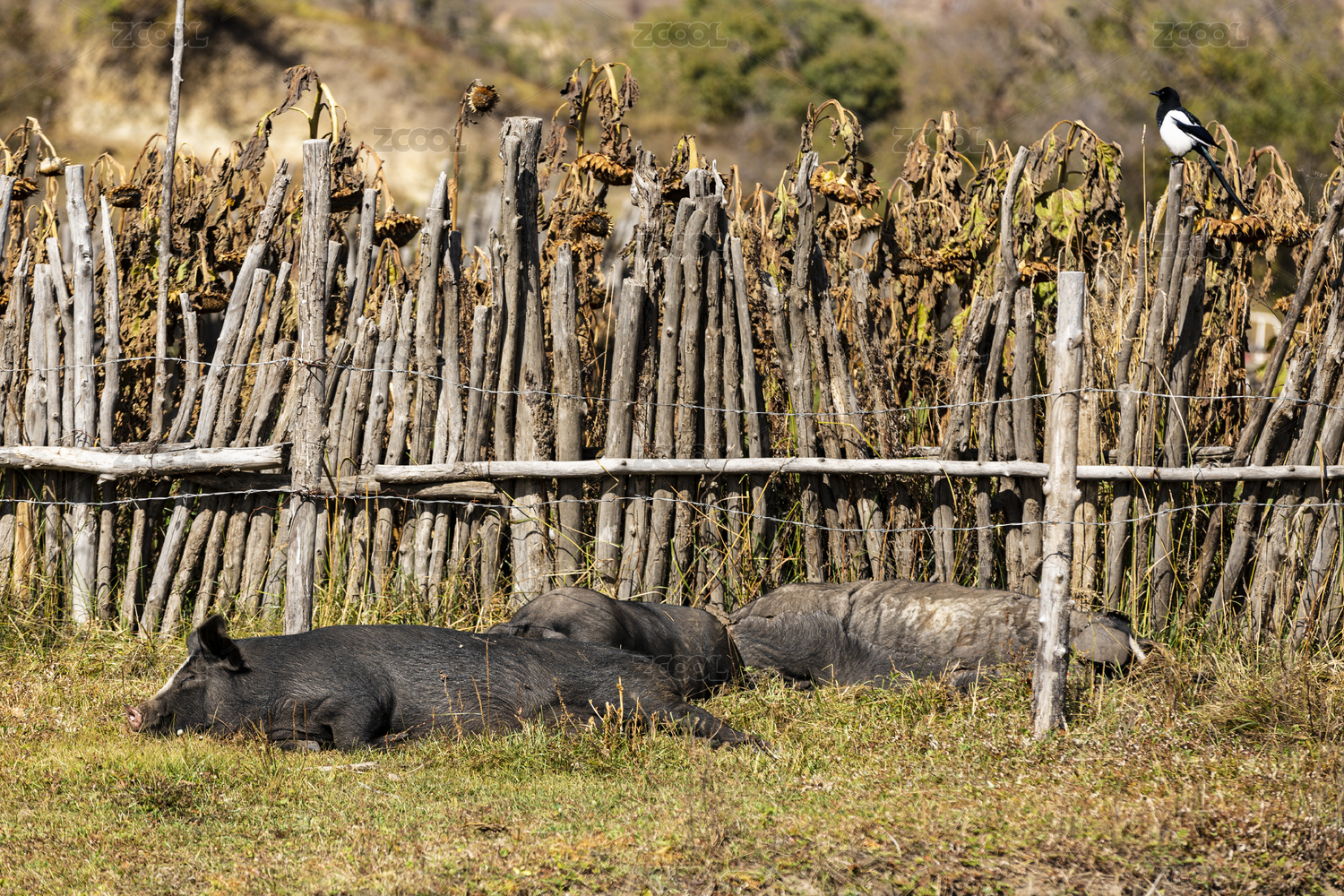秋天山村里柵欄前睡覺的黑豬