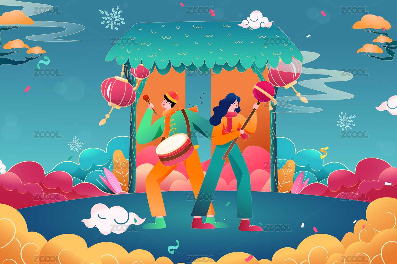卡通新年敲鑼打鼓中國風(fēng)背景矢量插畫