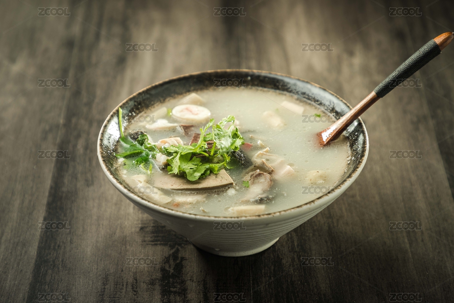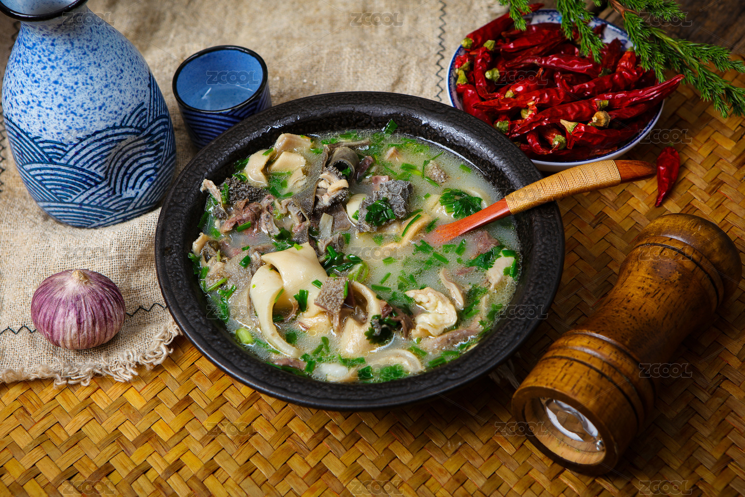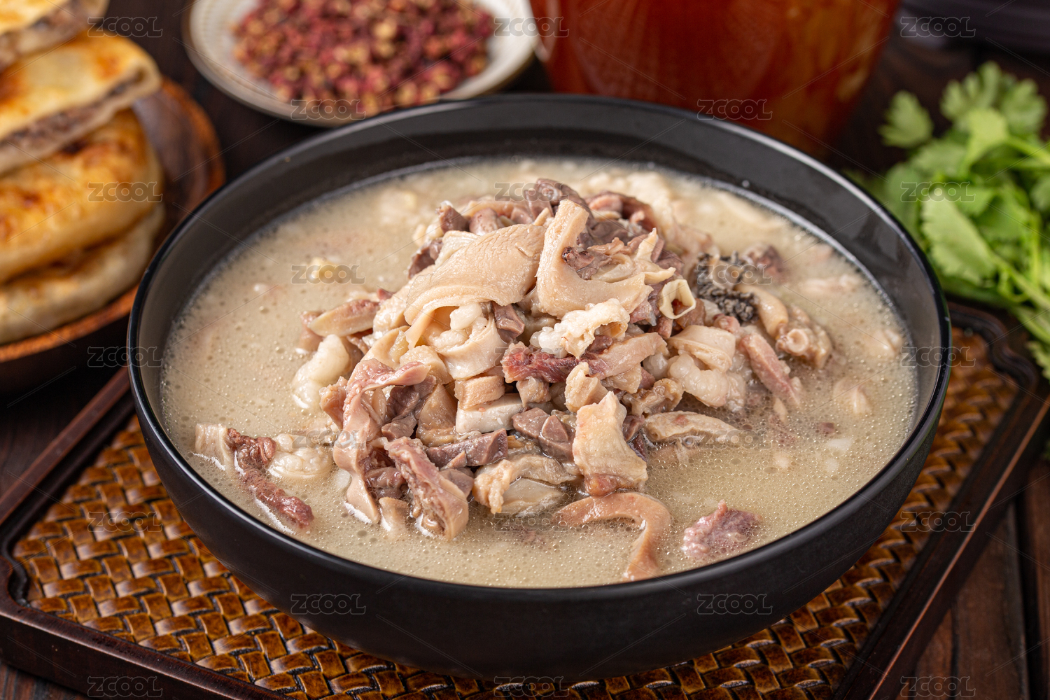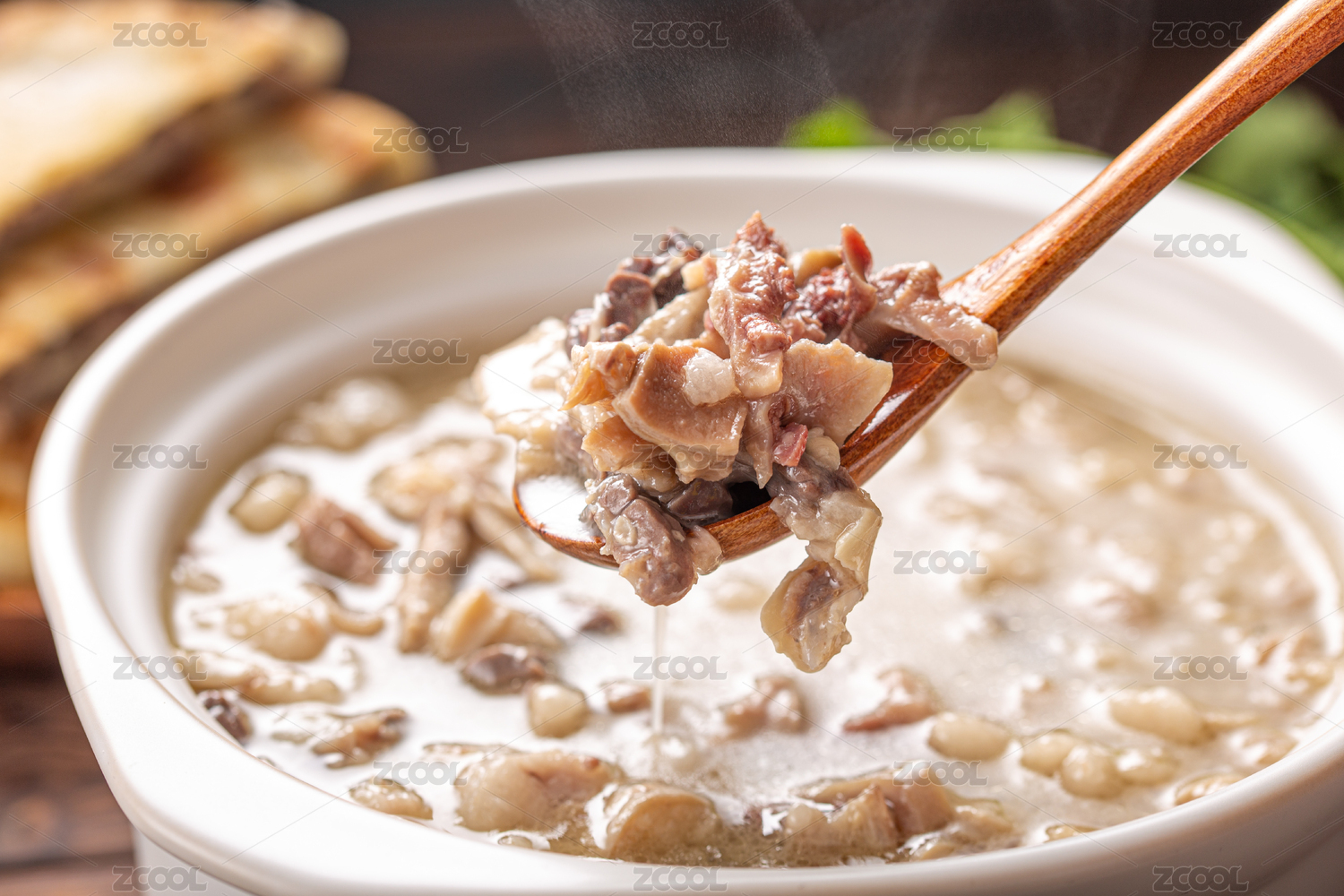 暗色木紋桌面上放著插著木勺的一碗羊雜湯