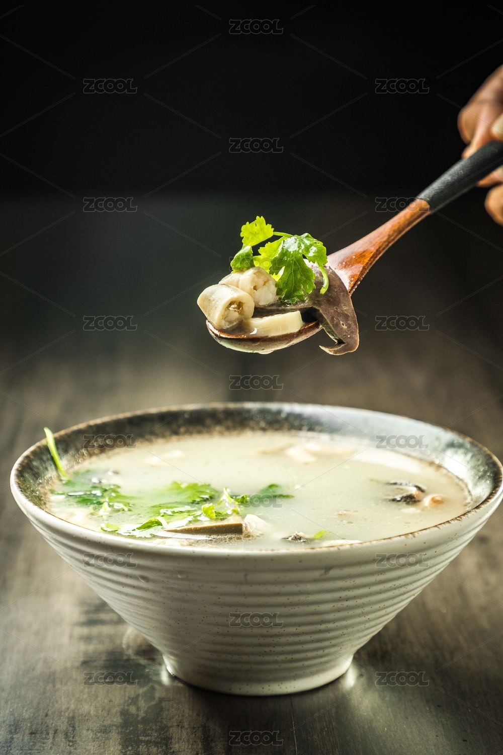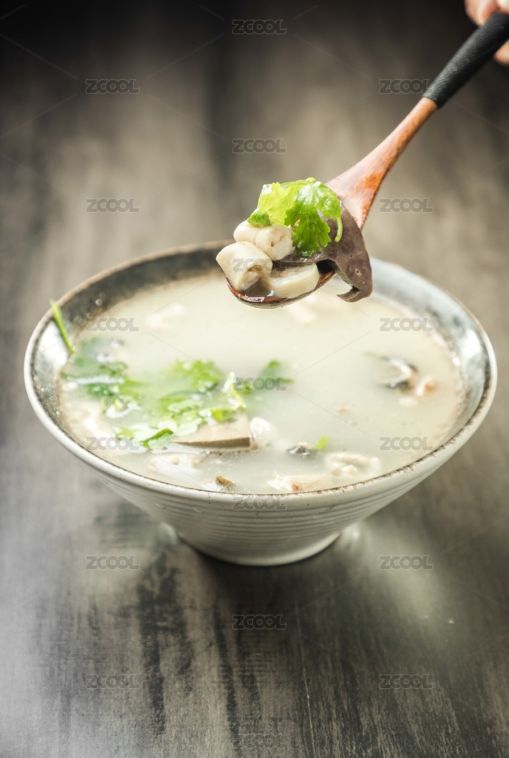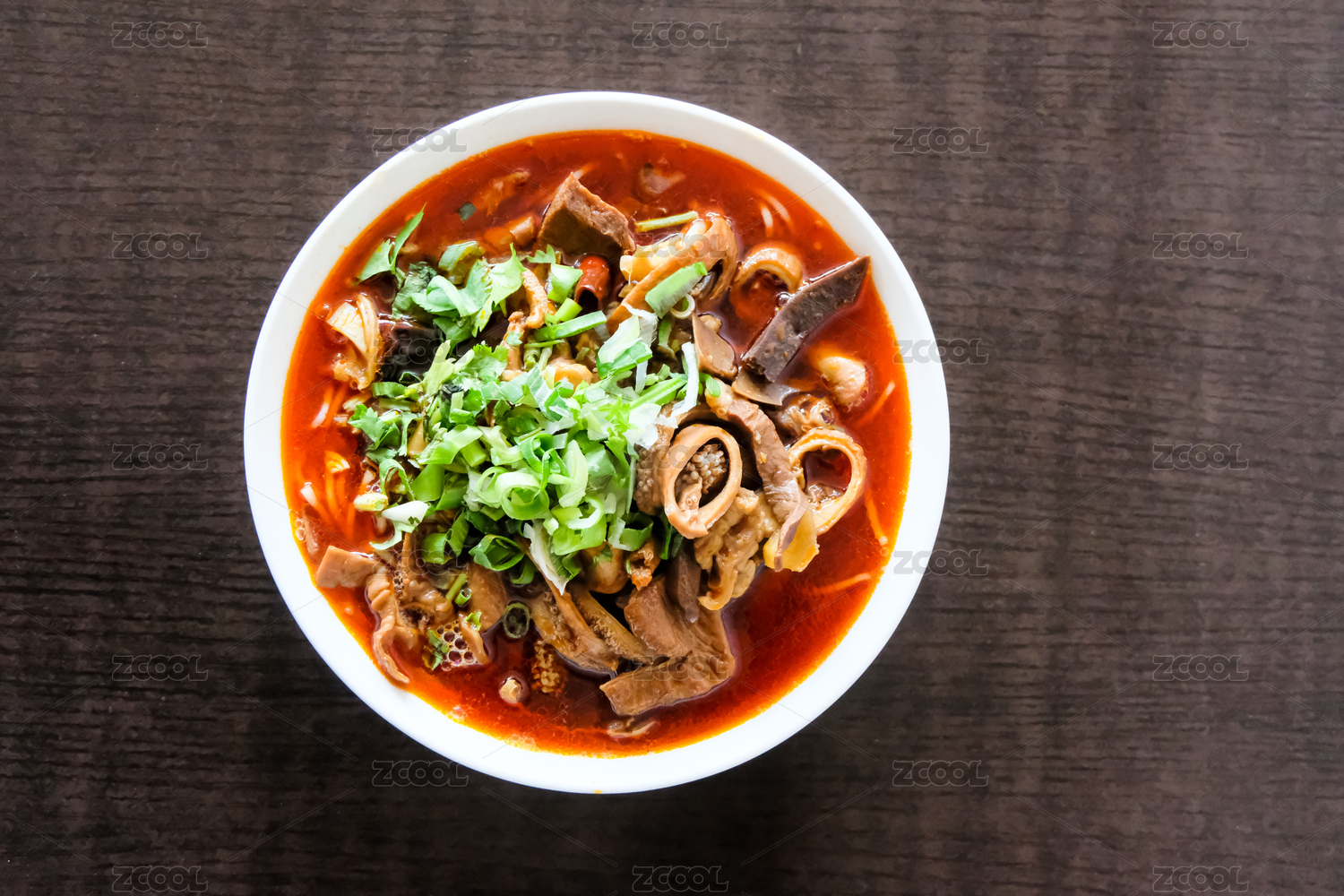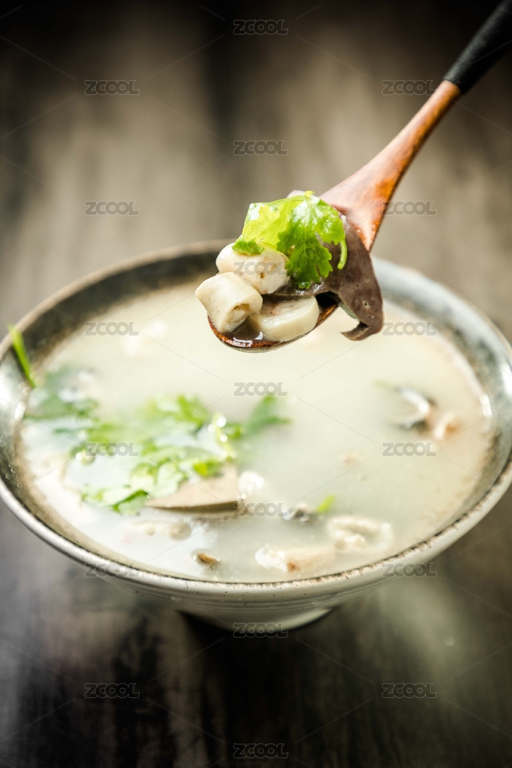 暗色木紋桌面上放著插著木勺的一碗羊雜湯