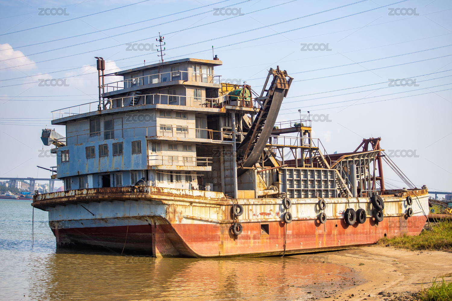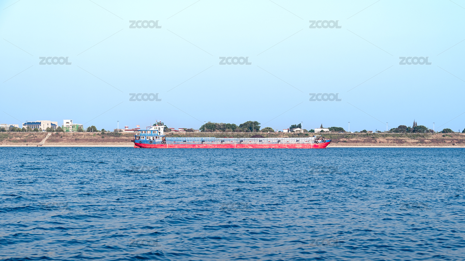 在水運航道上緩慢行駛的紅色運沙船