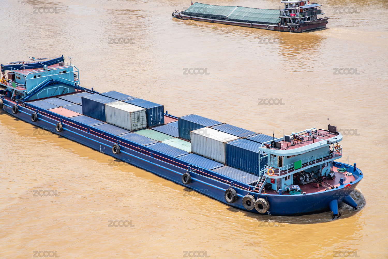 內(nèi)河航道河面上航行的一艘集裝箱船
