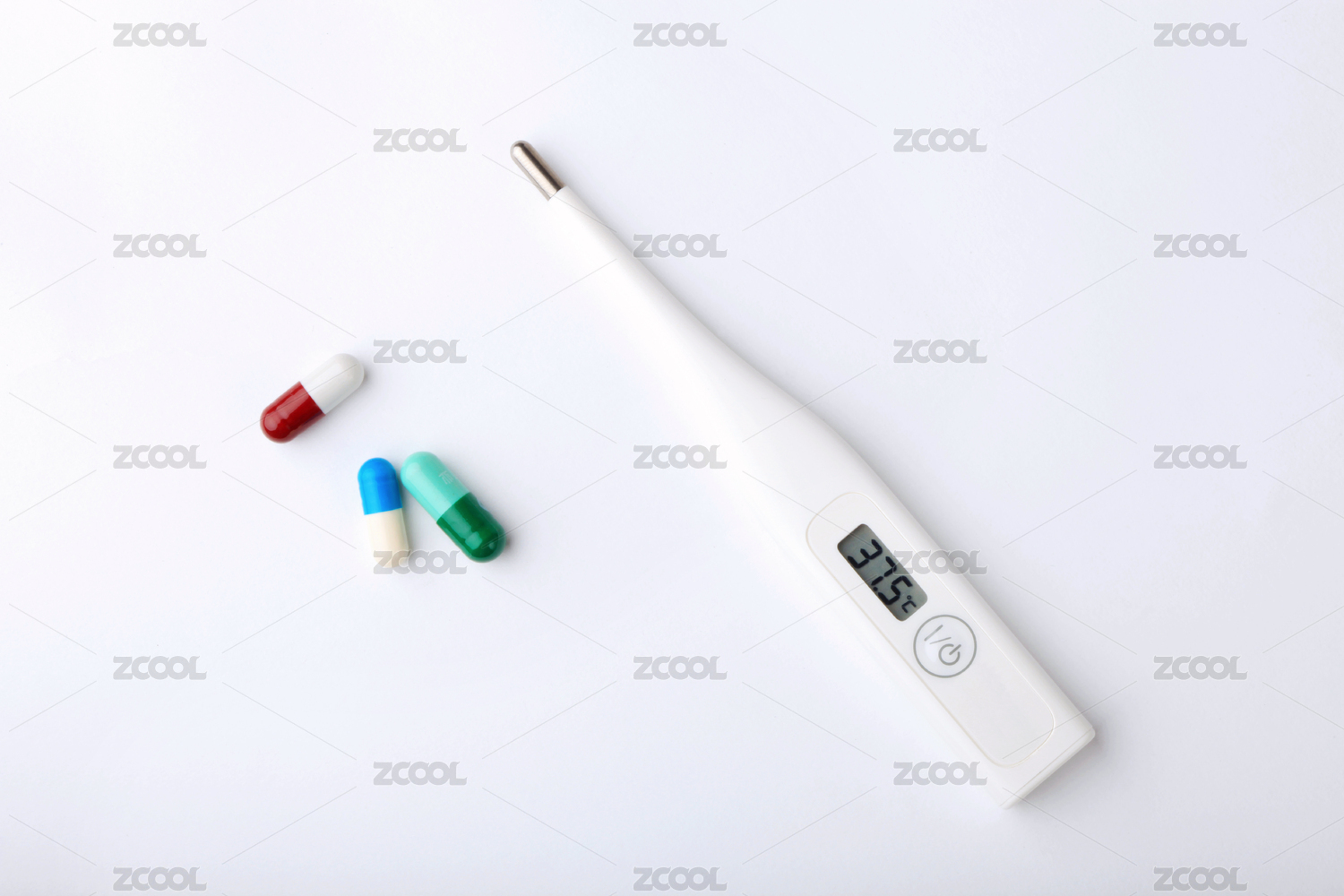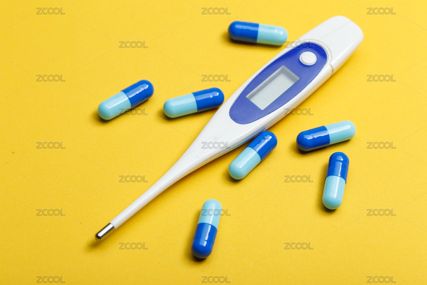 電子體溫計(jì)和藍(lán)色膠囊藥瓶放在黃色背景上