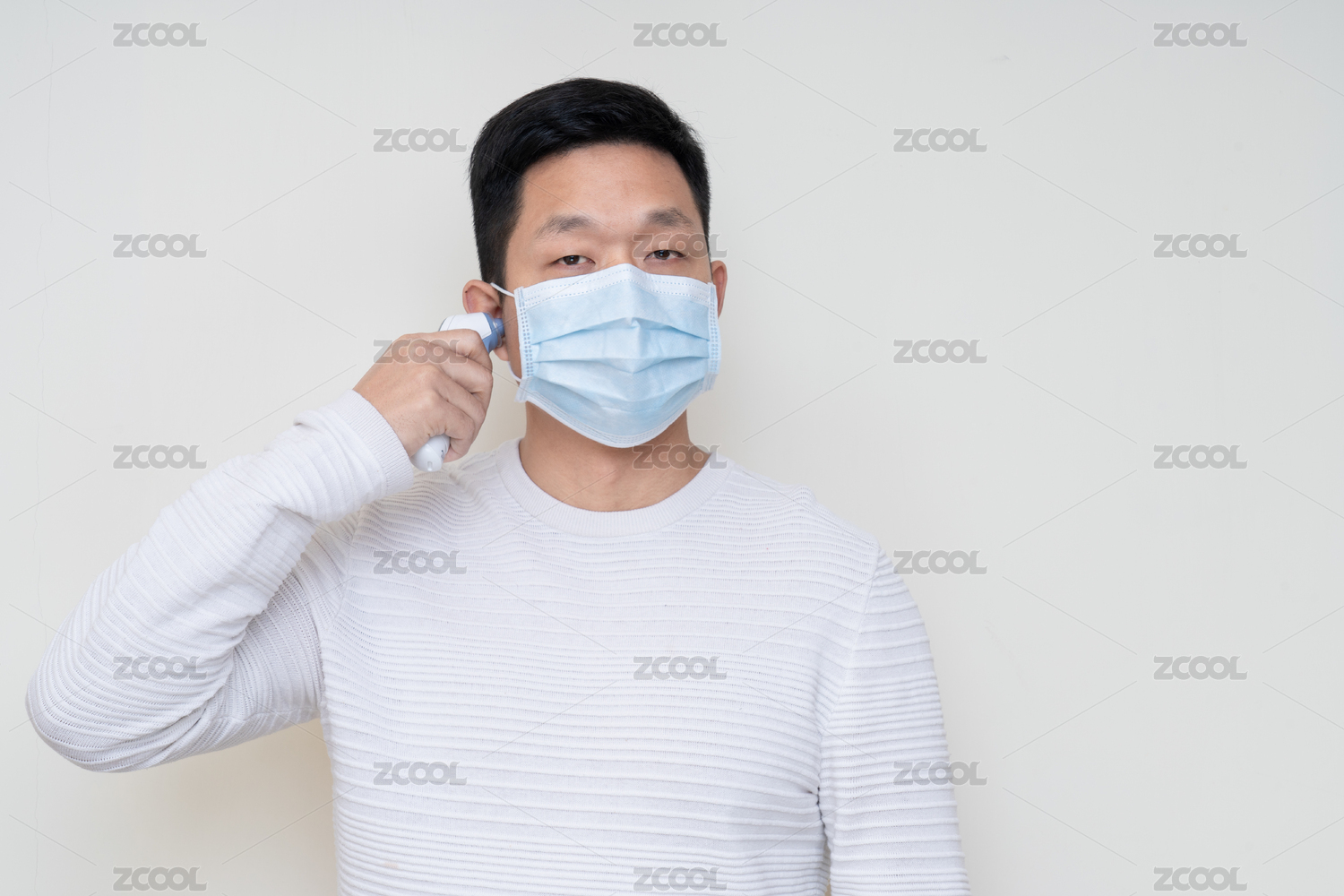 戴口罩的中國(guó)男人使用電子體溫計(jì)