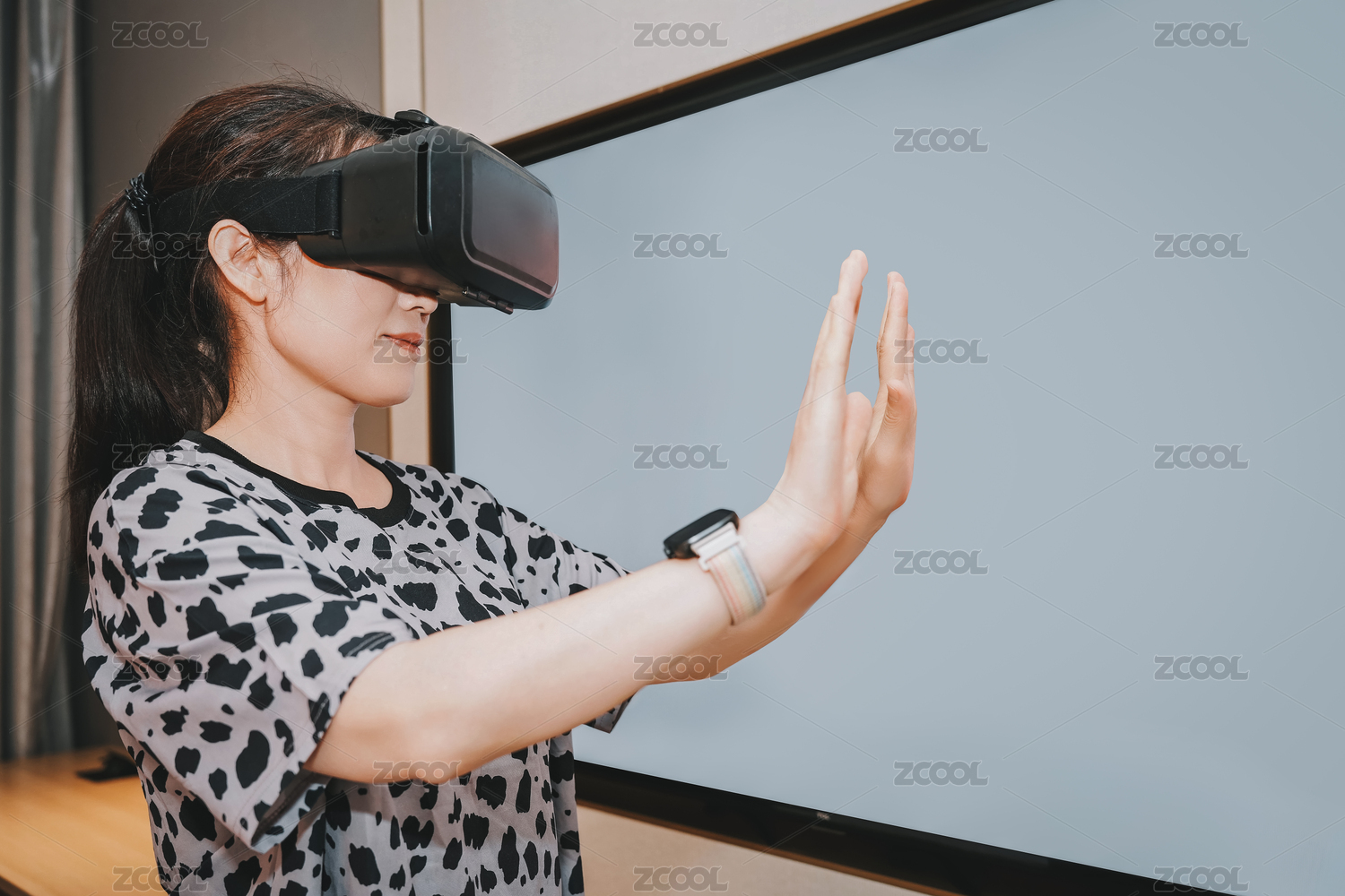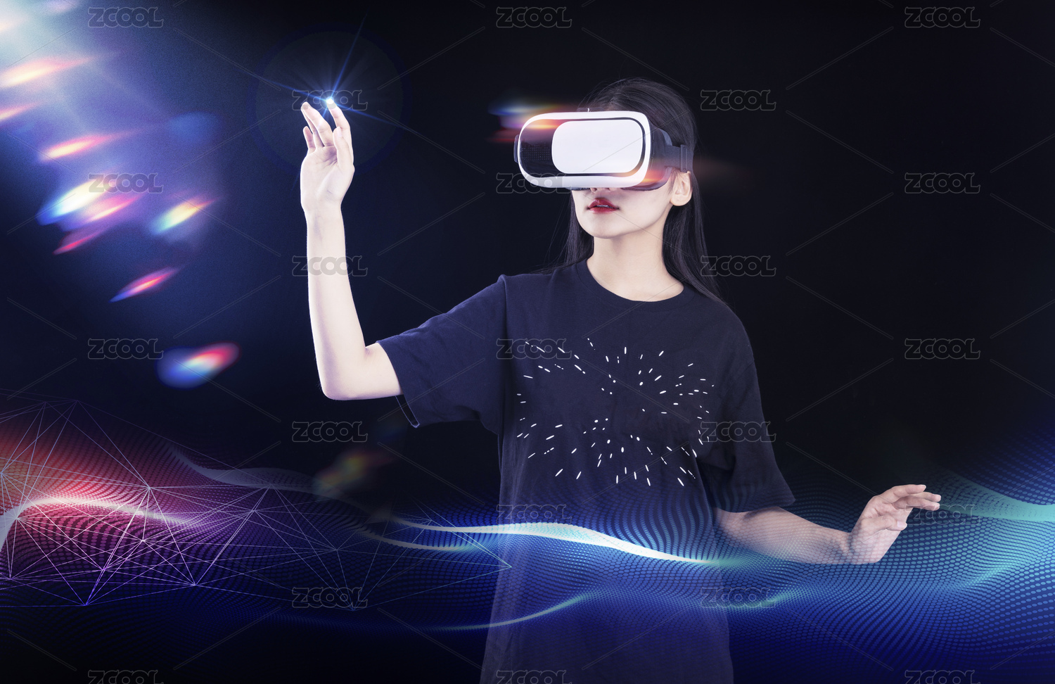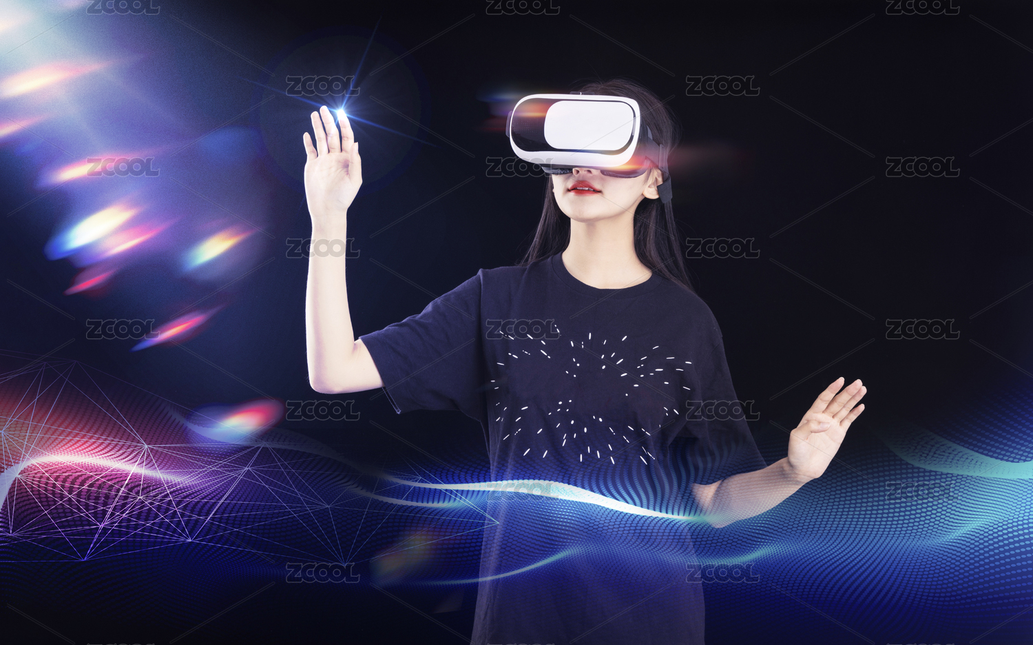 戴著VR虛擬現(xiàn)實(shí)眼鏡的年輕女人