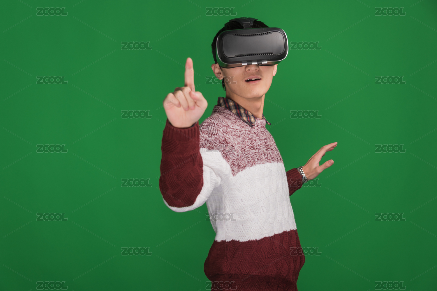 男子戴著VR虛擬現(xiàn)實(shí)頭盔舉起手觸摸屏幕未來(lái)高科技概念