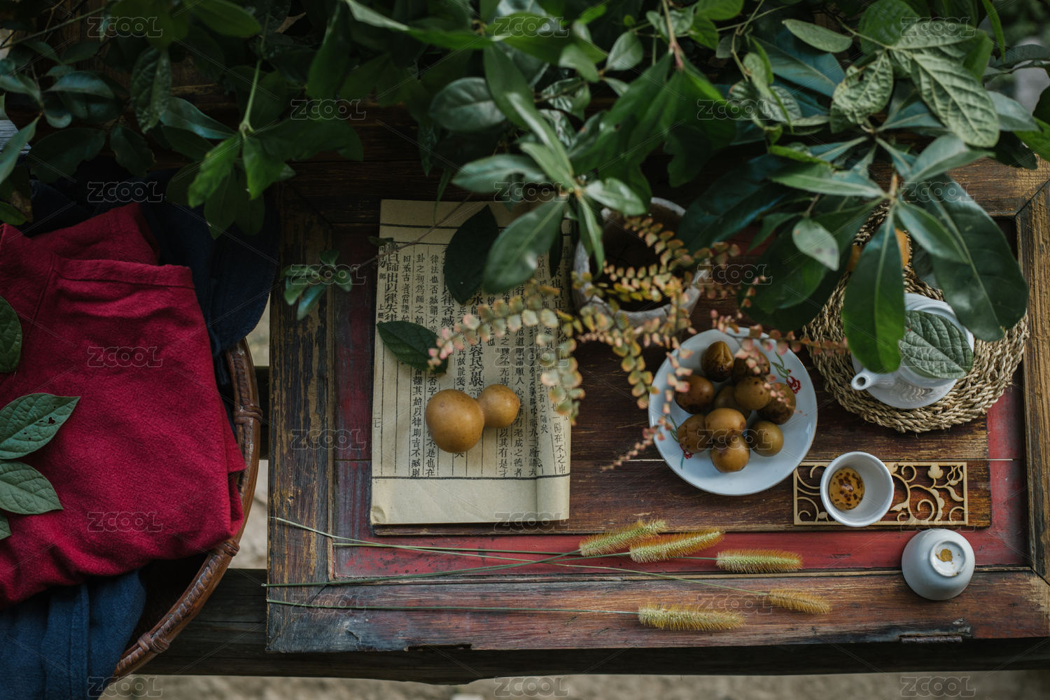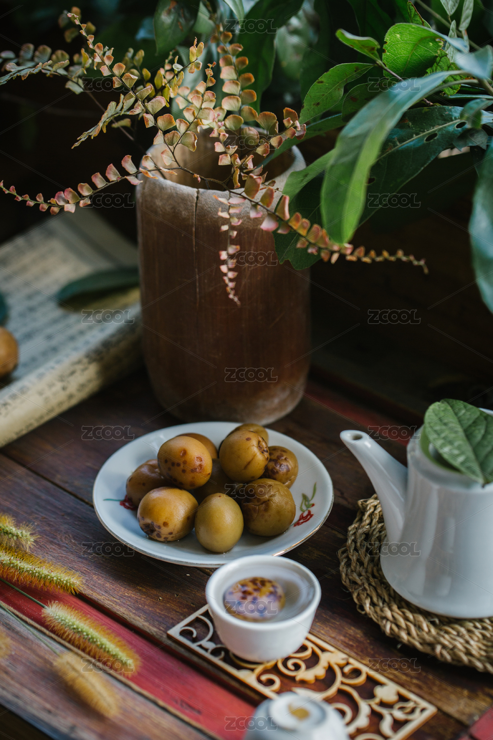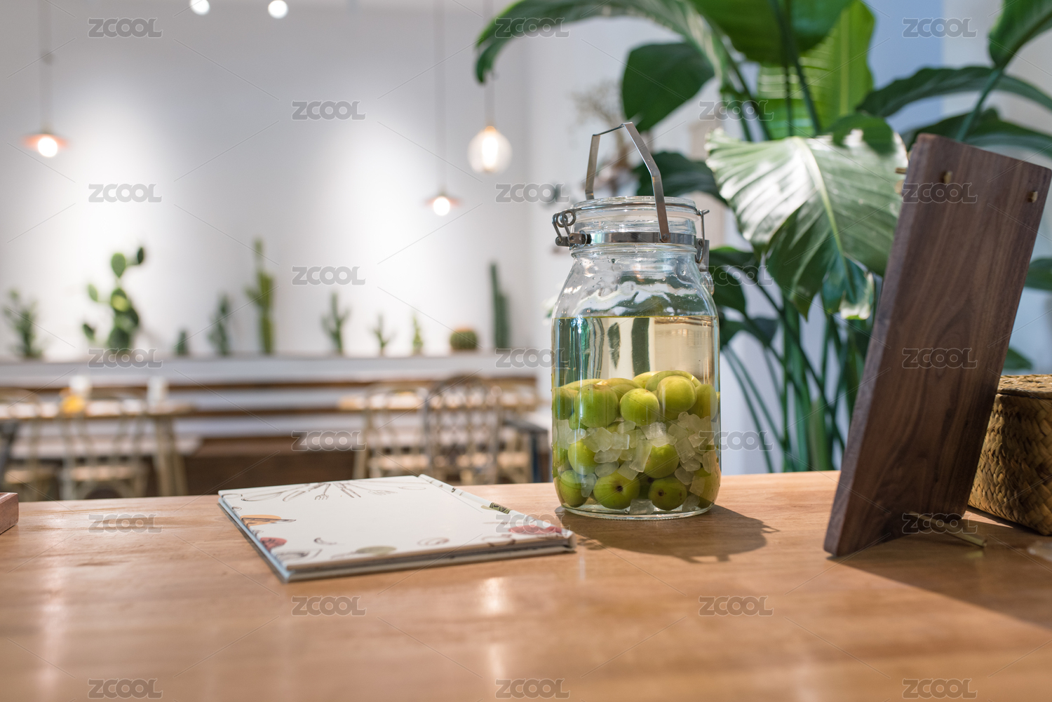 桌上擺著梅子酒和書(shū)本,還有植物
