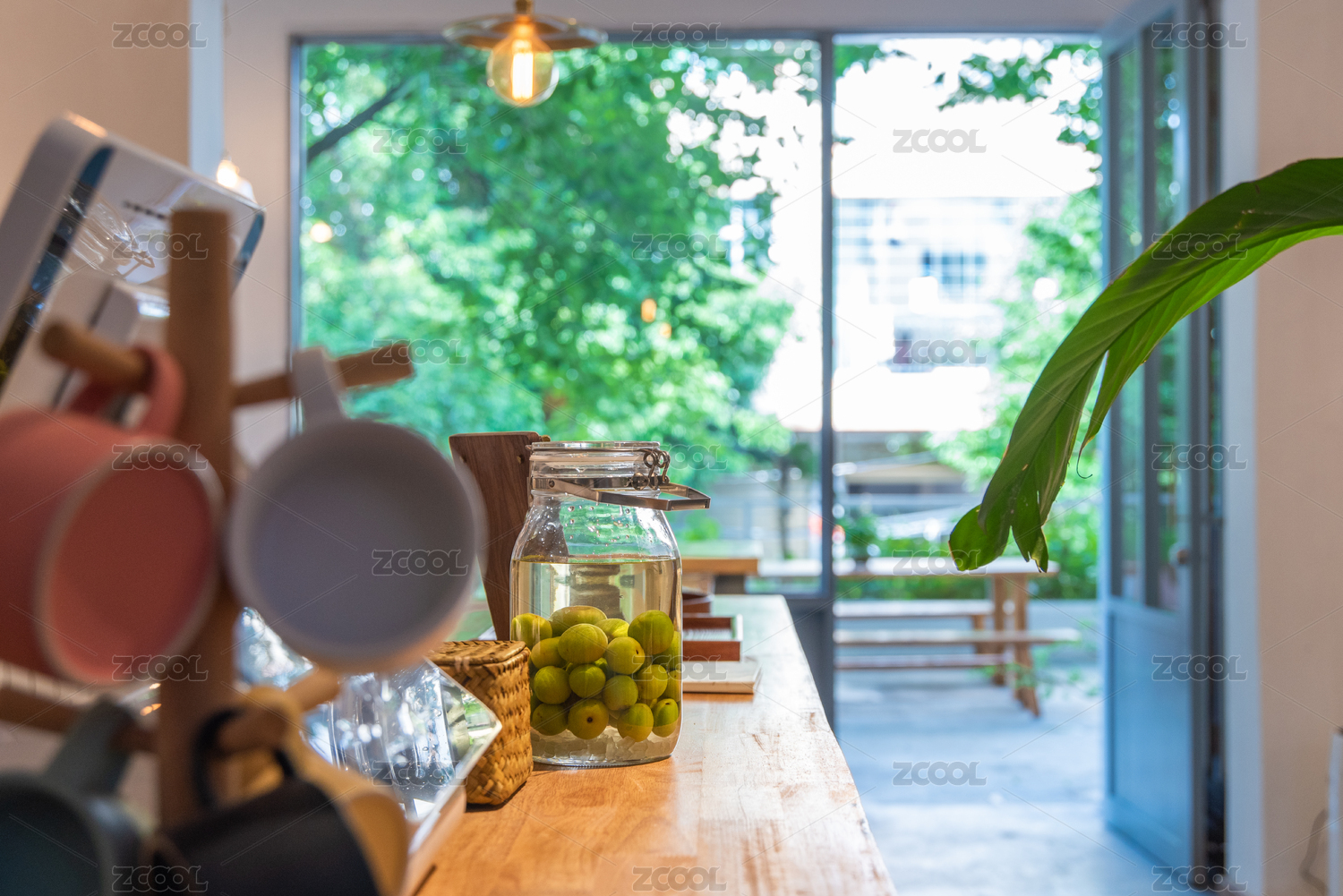 落地窗前餐廳吧臺(tái)上的玻璃罐裝自制梅子酒