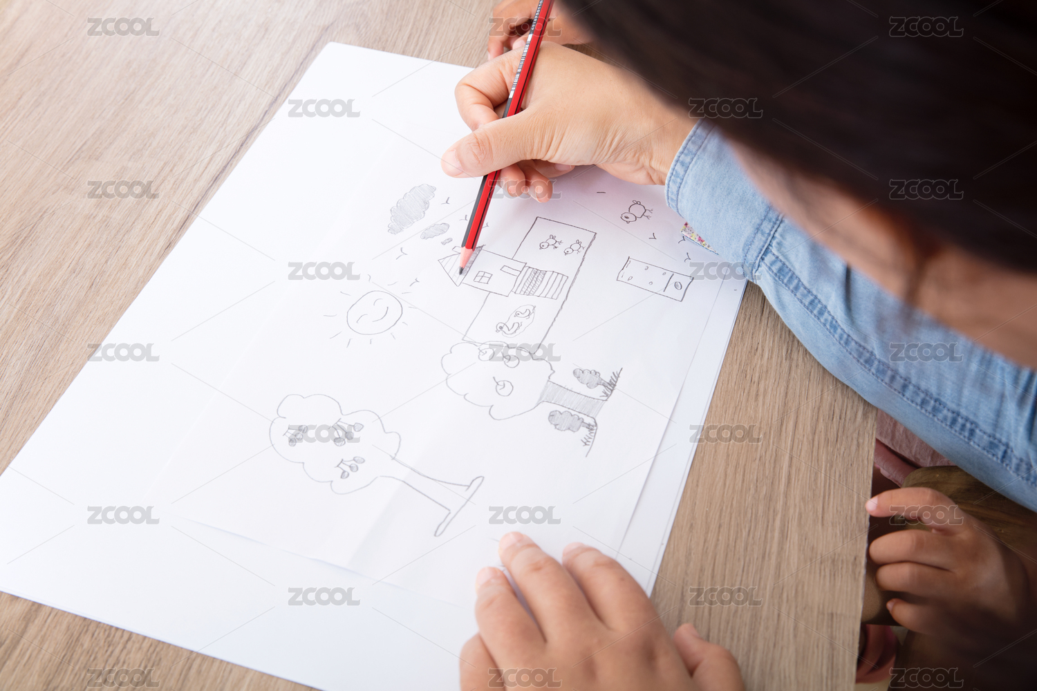 白背景前老師或孩子的媽媽在教孩子學(xué)習(xí)繪畫