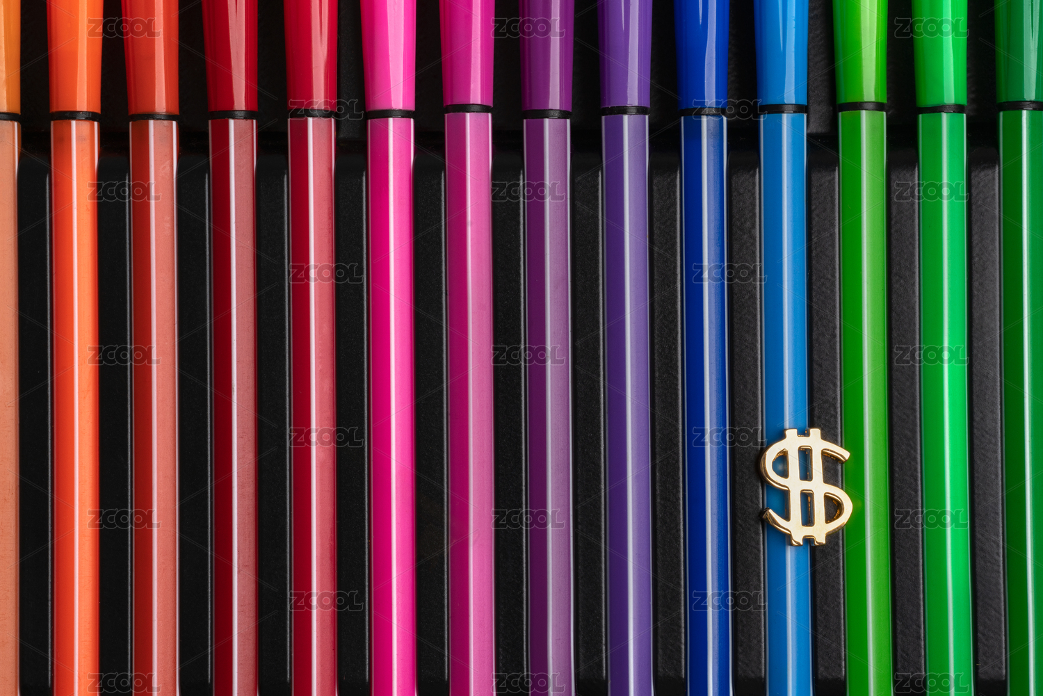 一個放在繪畫水彩筆上的金錢符號微縮靜物圖
