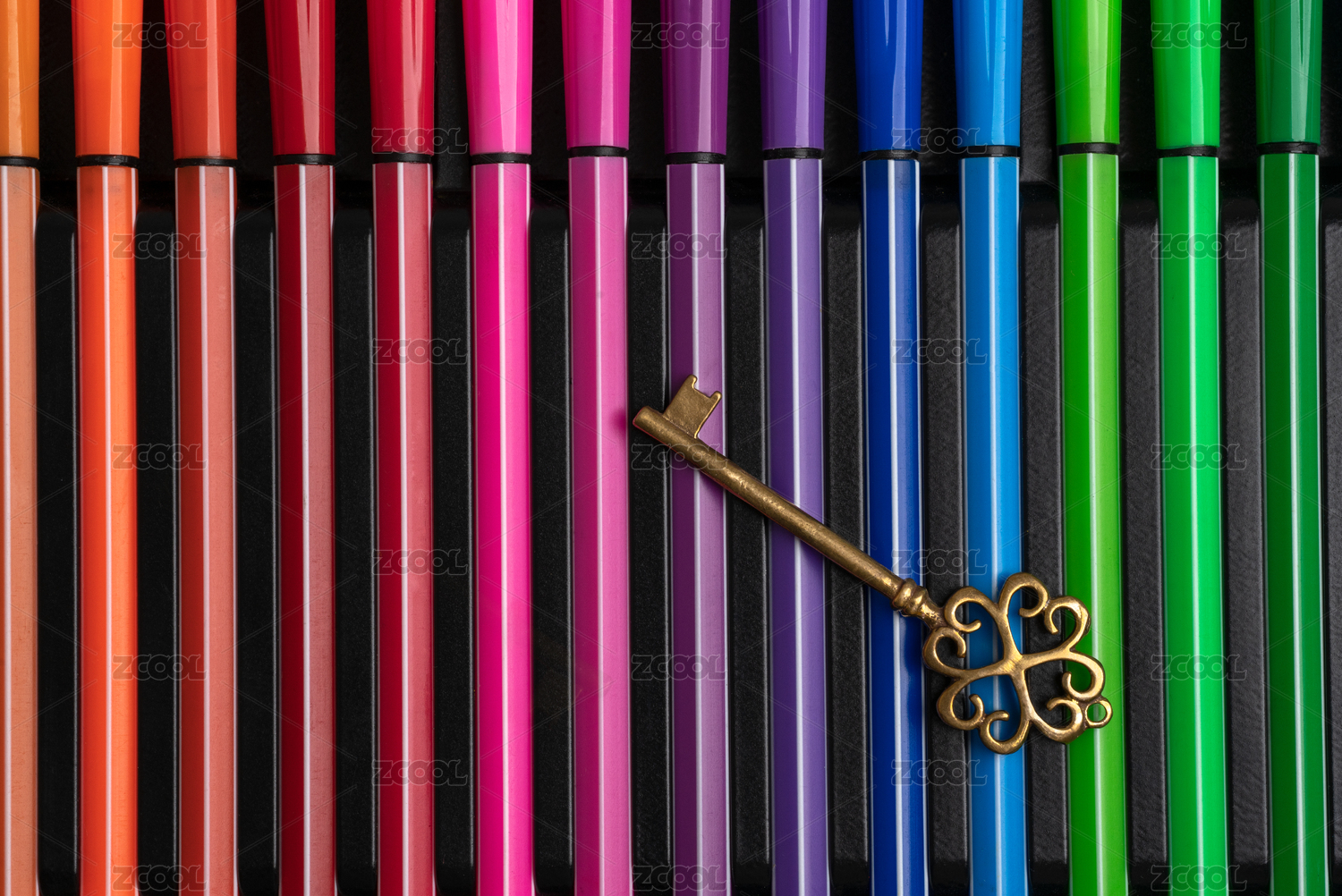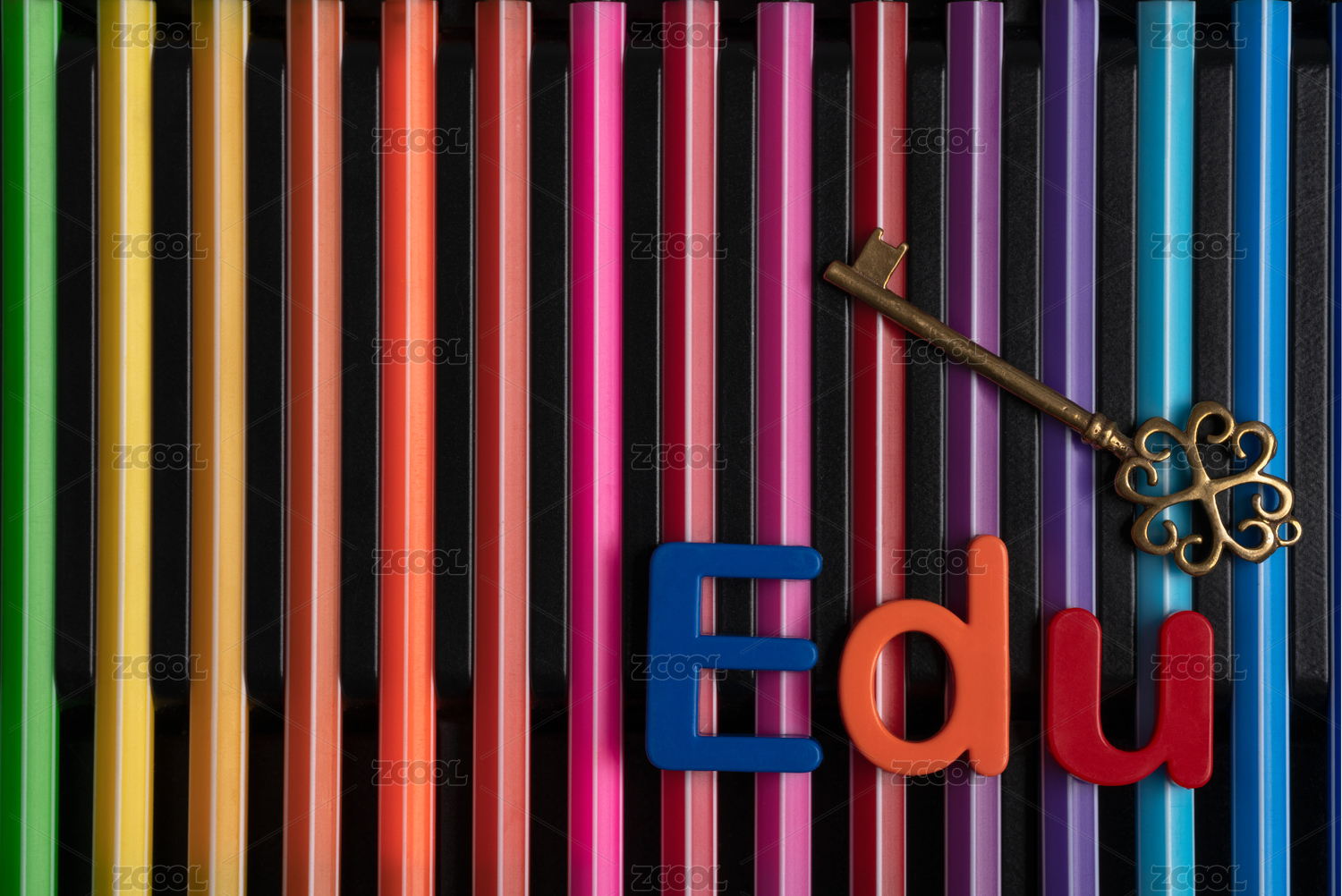 鑰匙水彩筆和教育縮寫EDU靜物圖