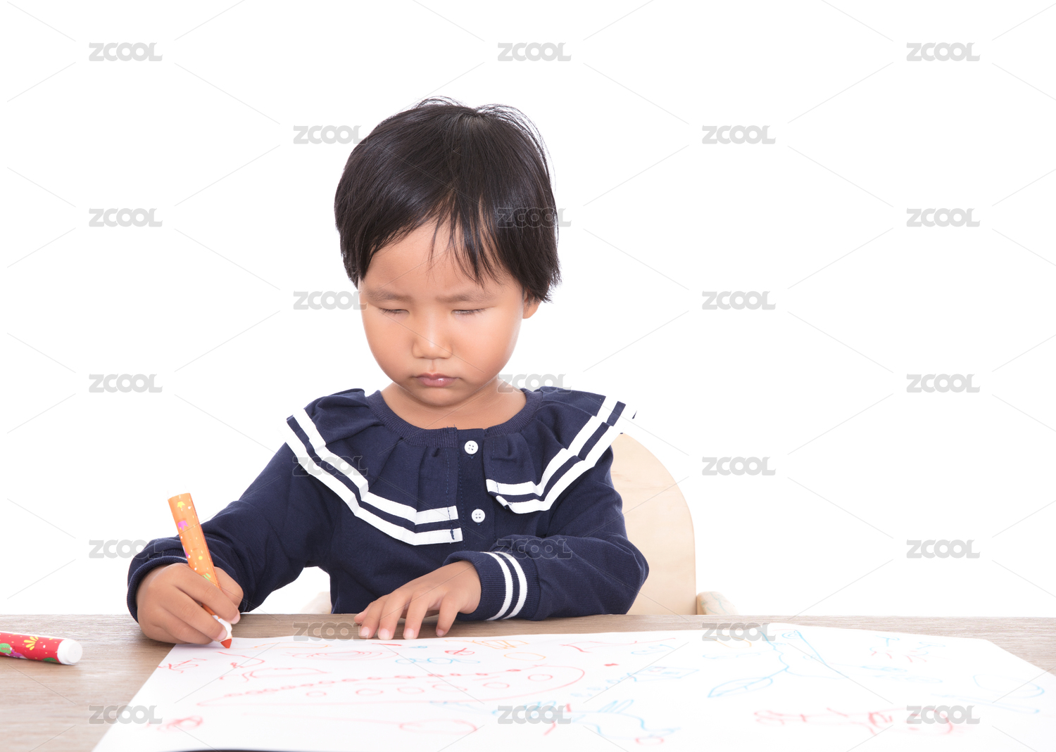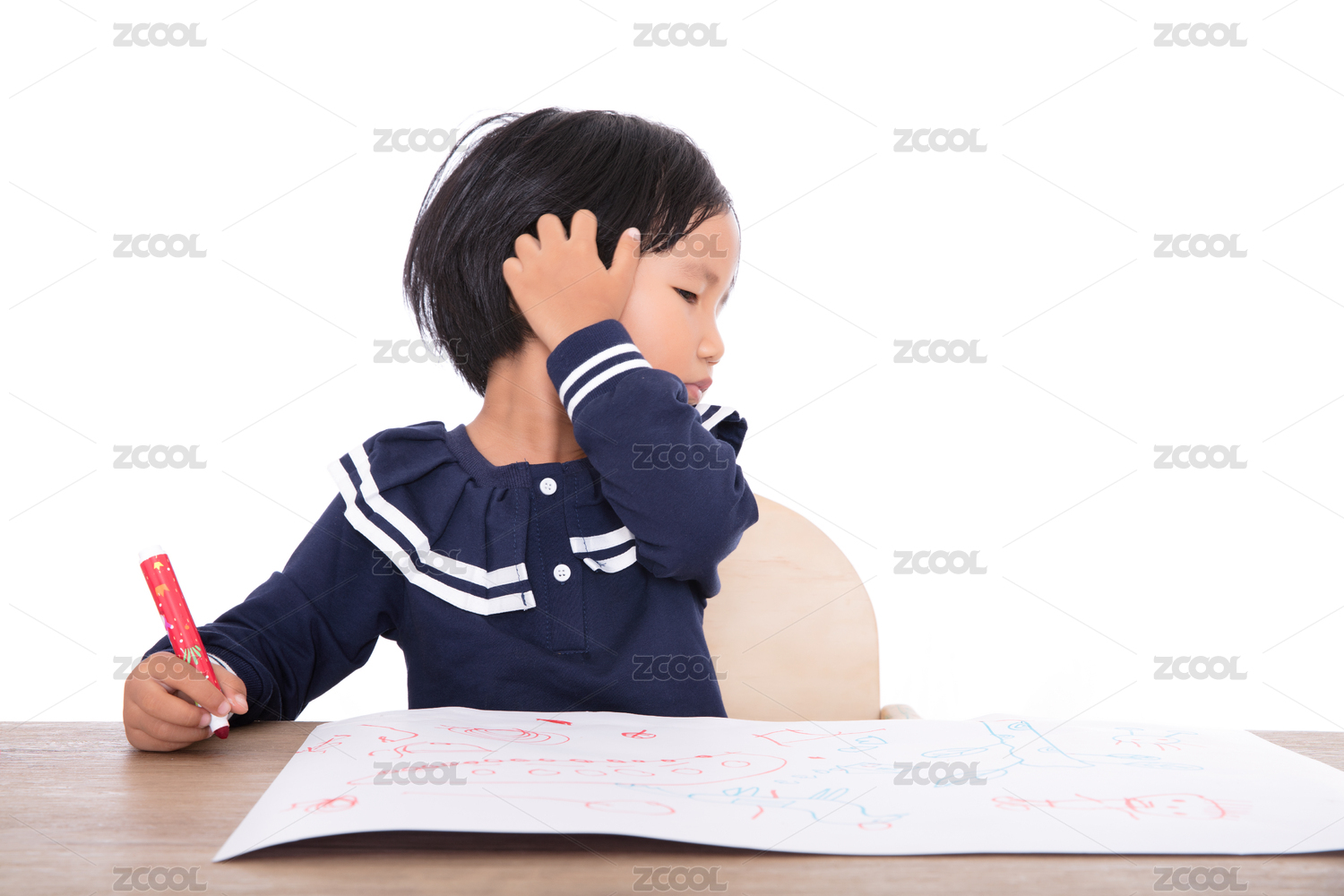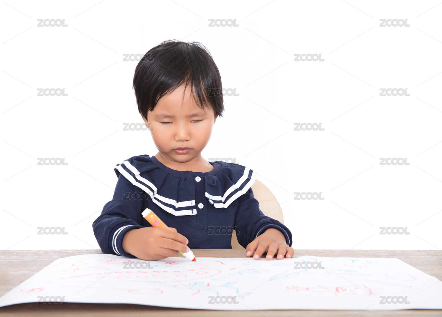 白背景前的書桌旁練習(xí)繪畫的小女孩