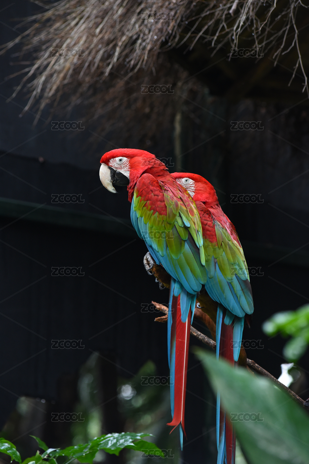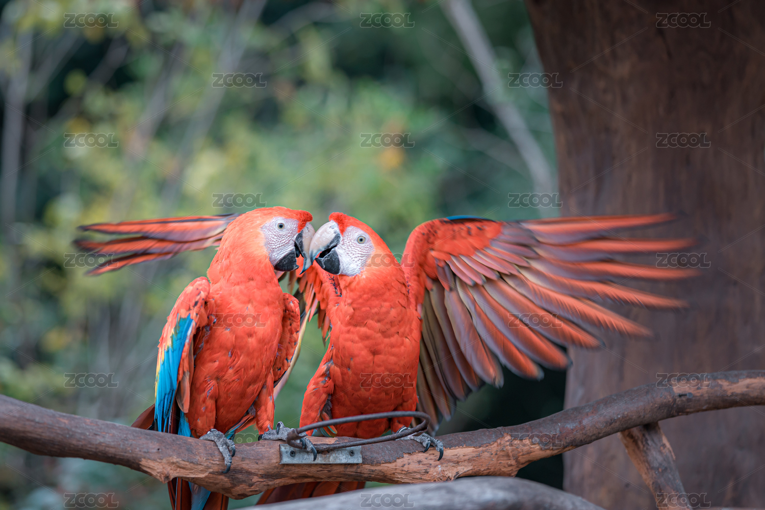 上海野生動(dòng)物園里的兩只金剛鸚鵡,其中一只正展開翅膀