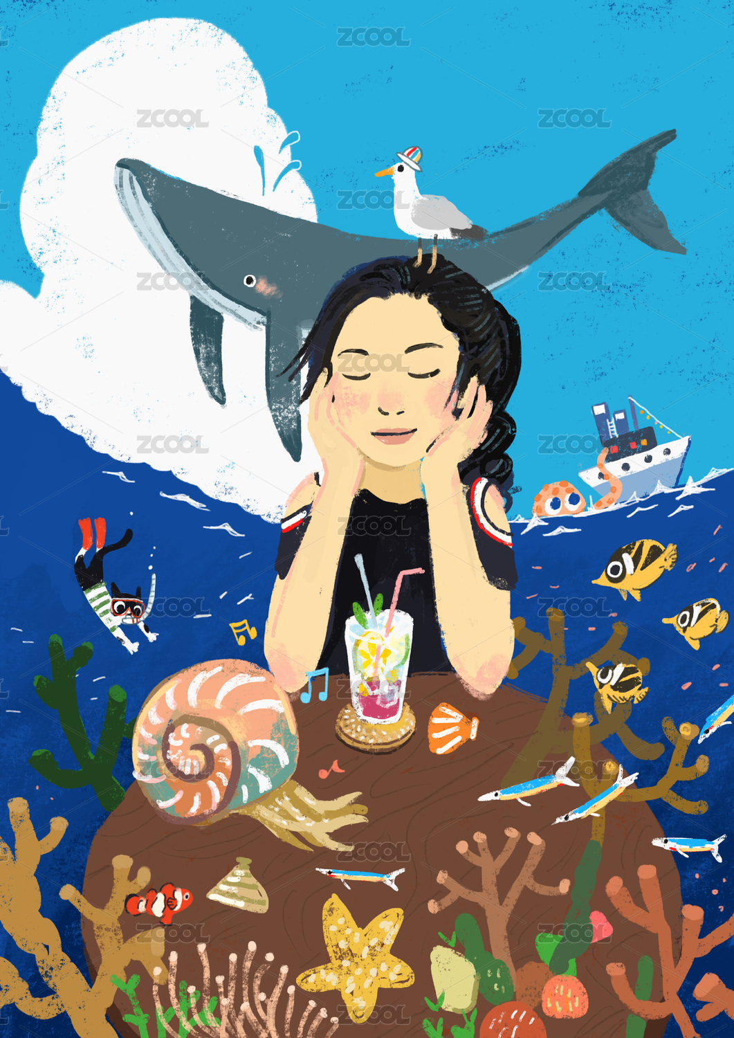 包含著海豚、海馬、鸚鵡螺、蝠鲼、海豹、小丑魚、鯨、翻車魚等海洋生物的矢量鋼筆畫
