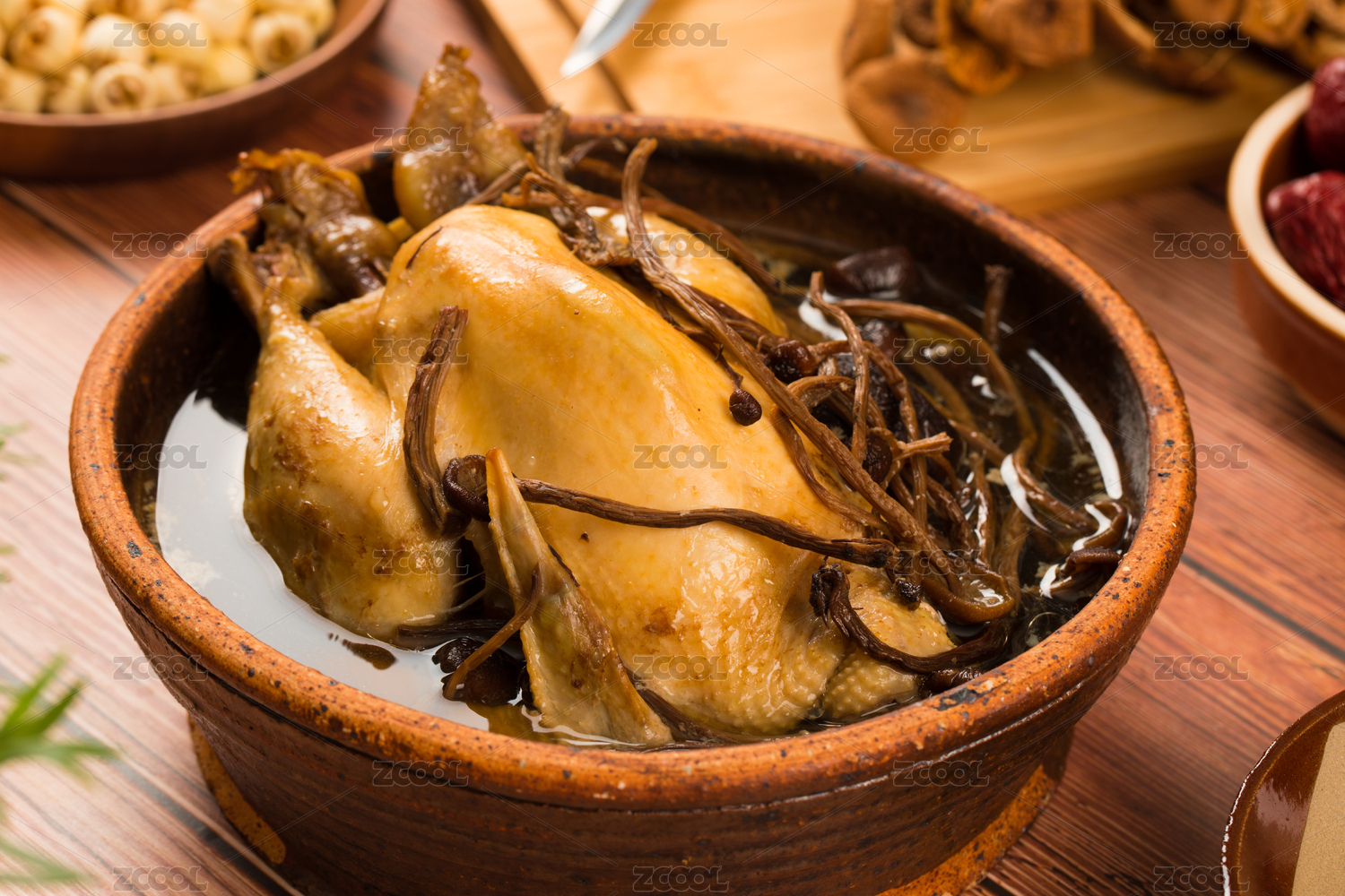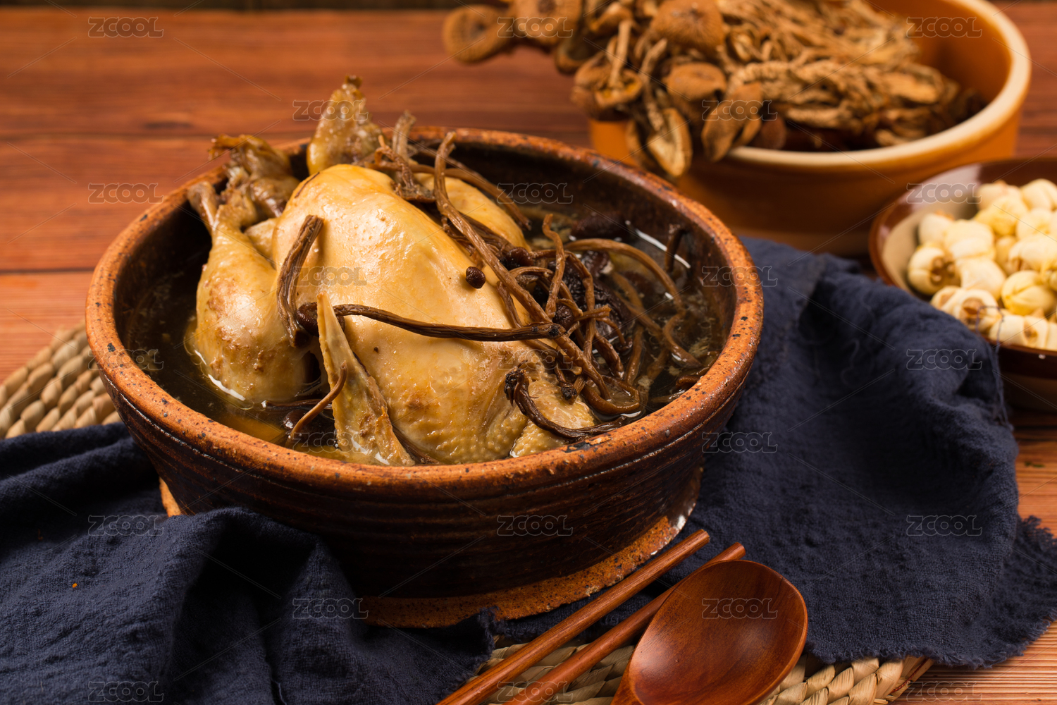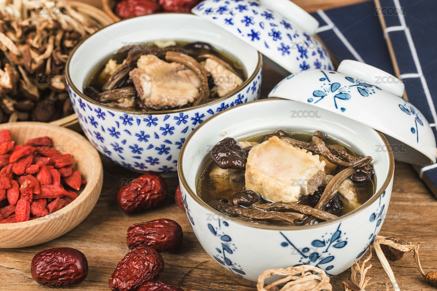 白背景營(yíng)養(yǎng)燉盅茶樹菇龍骨湯