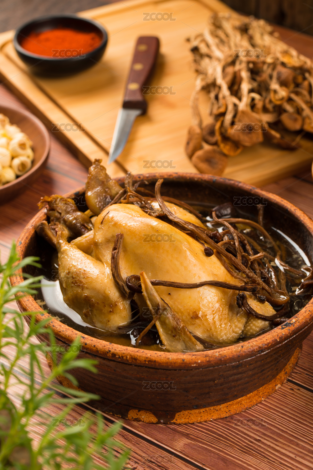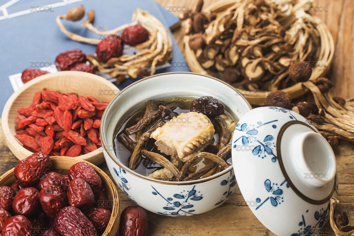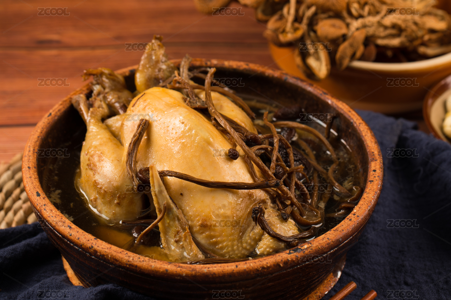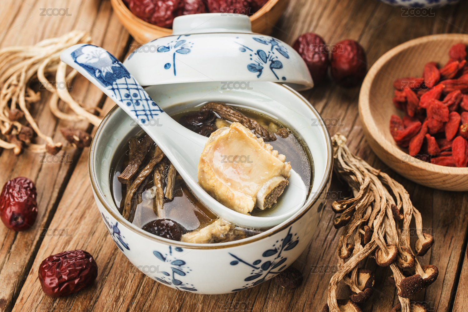 白背景營(yíng)養(yǎng)燉盅茶樹菇龍骨湯