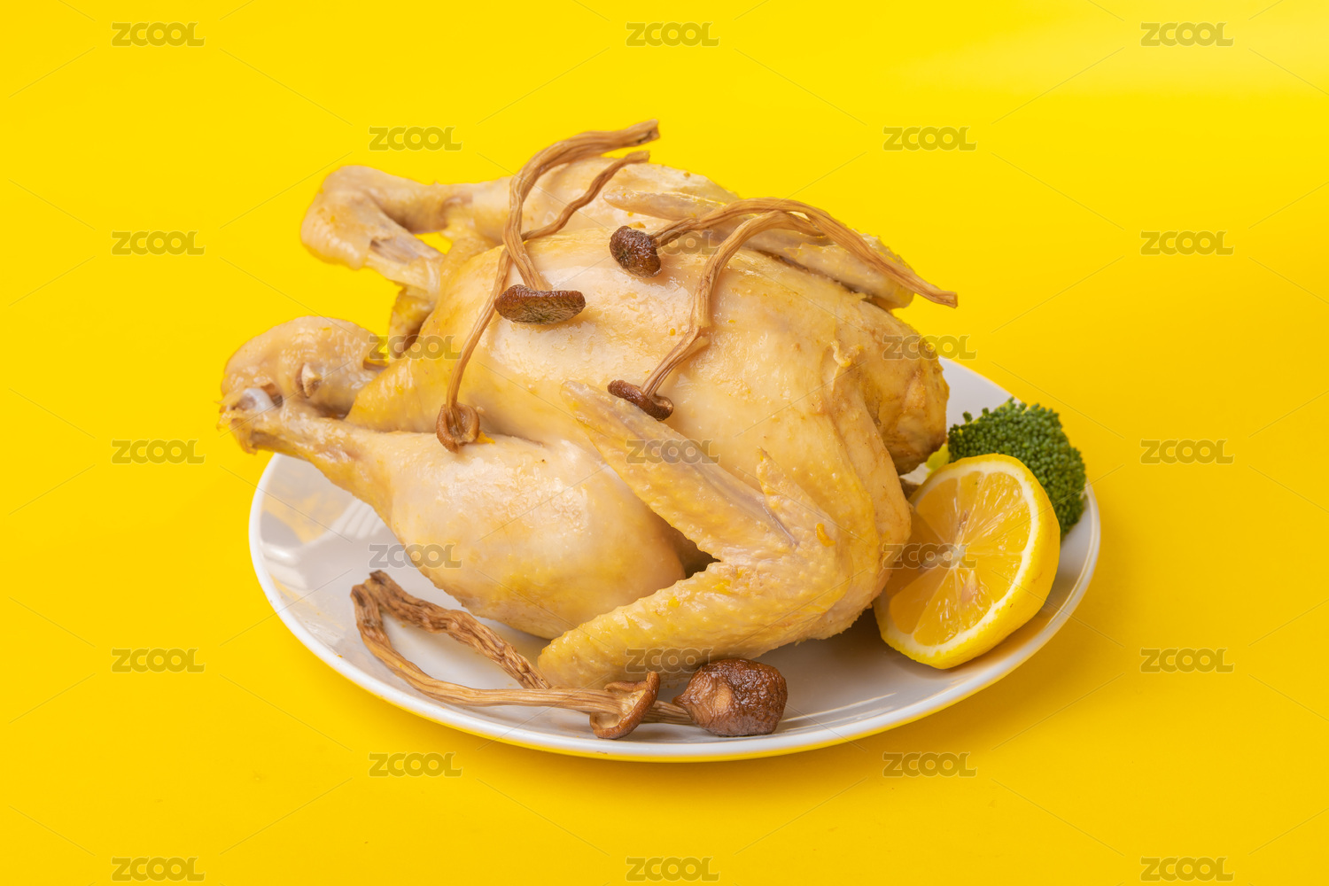 黃色桌面上放著一盤蒸茶樹菇三黃雞