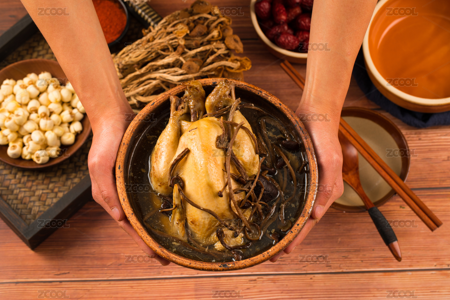 手端著美味的滋補(bǔ)茶樹菇雞湯