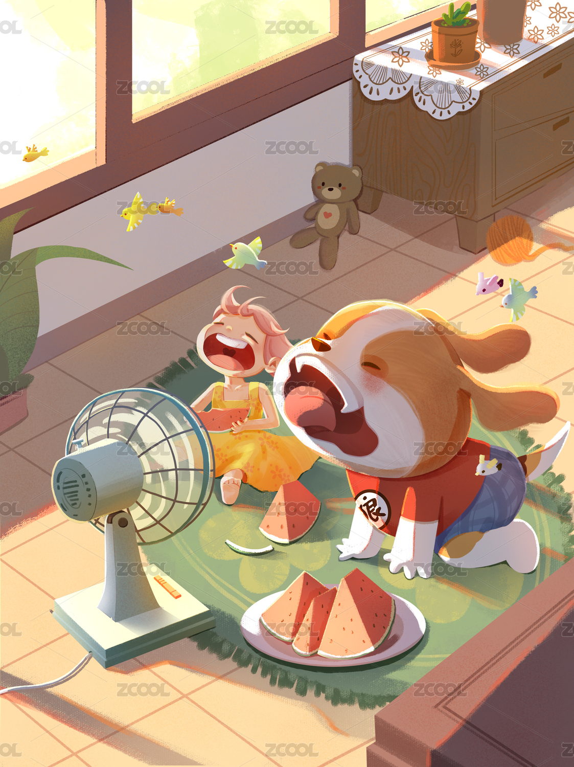 女孩和小狗爬在對著電風(fēng)扇