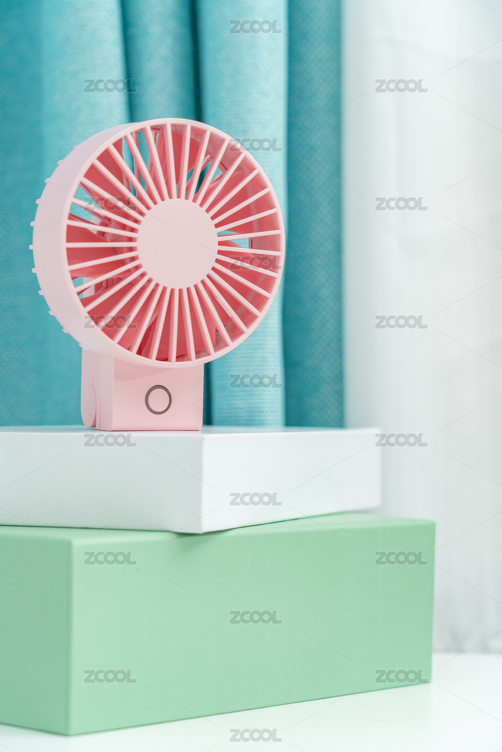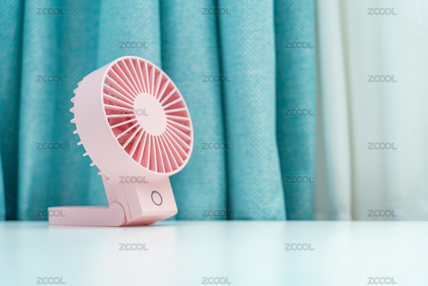 一臺粉色的電扇放在藍(lán)色窗簾前