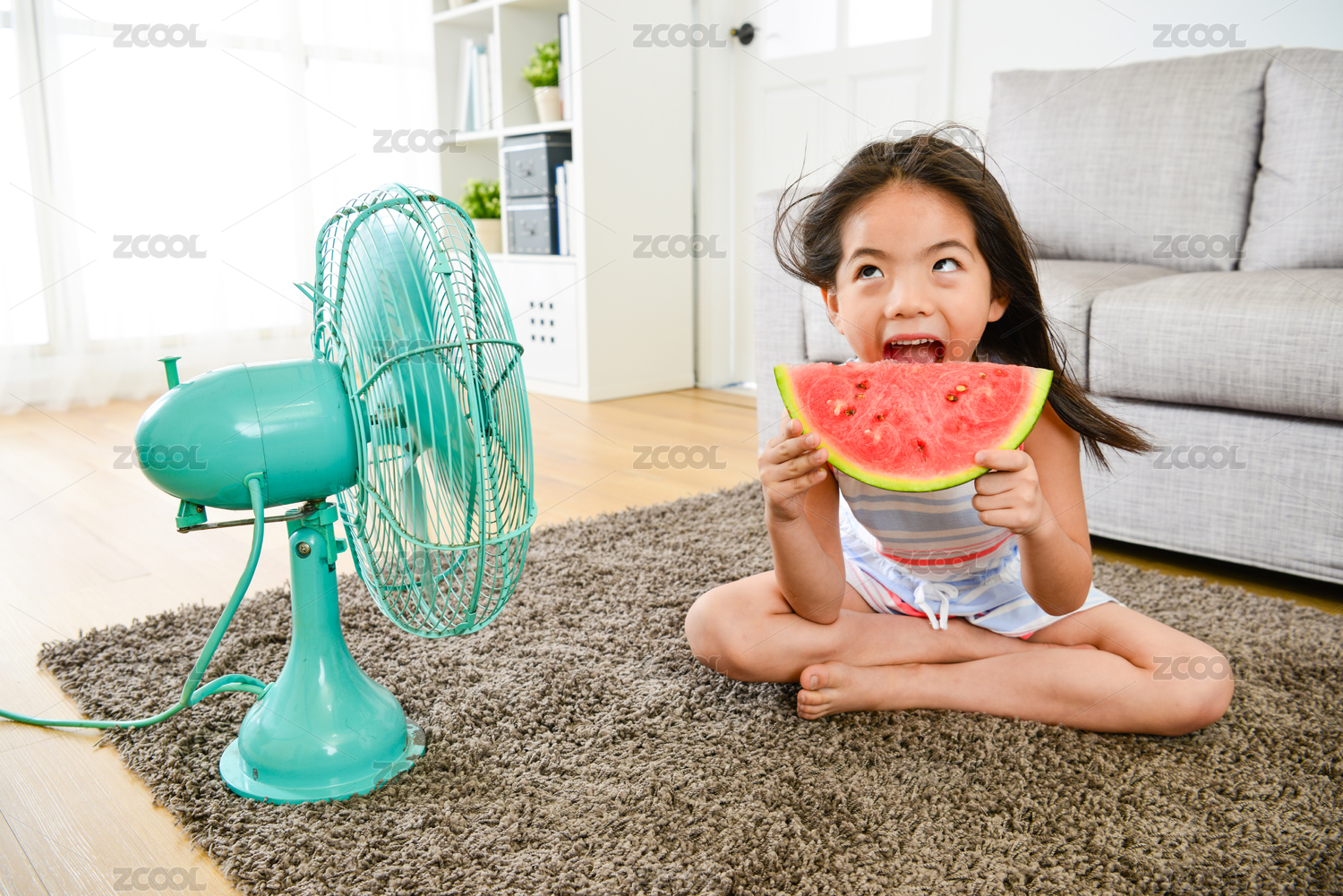 開朗的美少女小孩吃西瓜,夏天吹電扇。