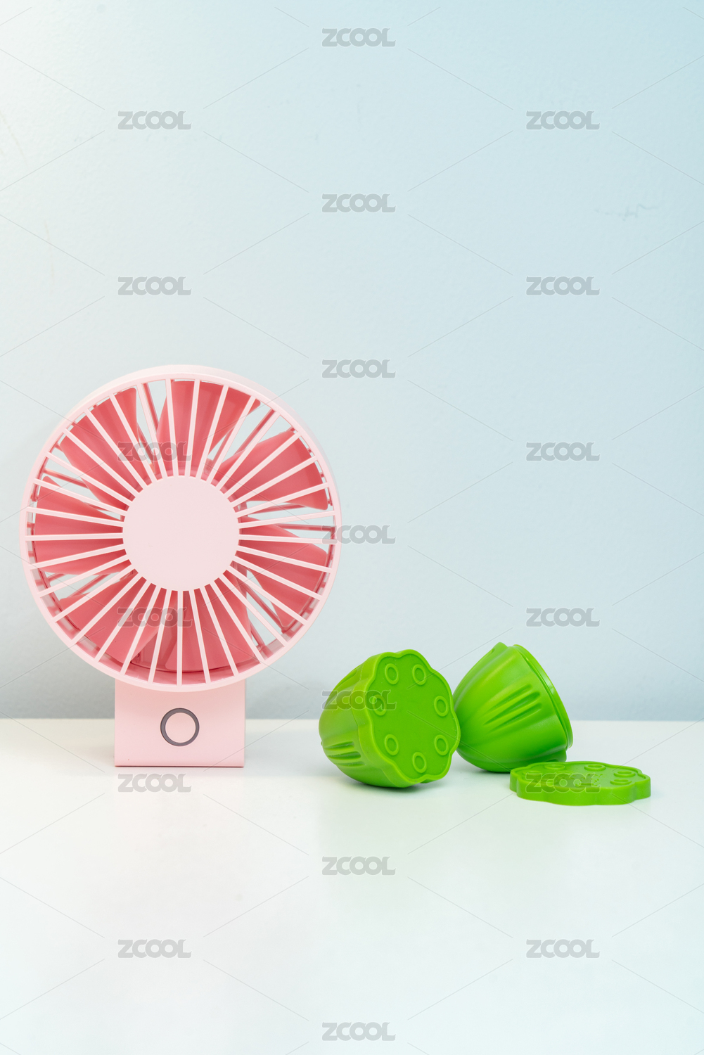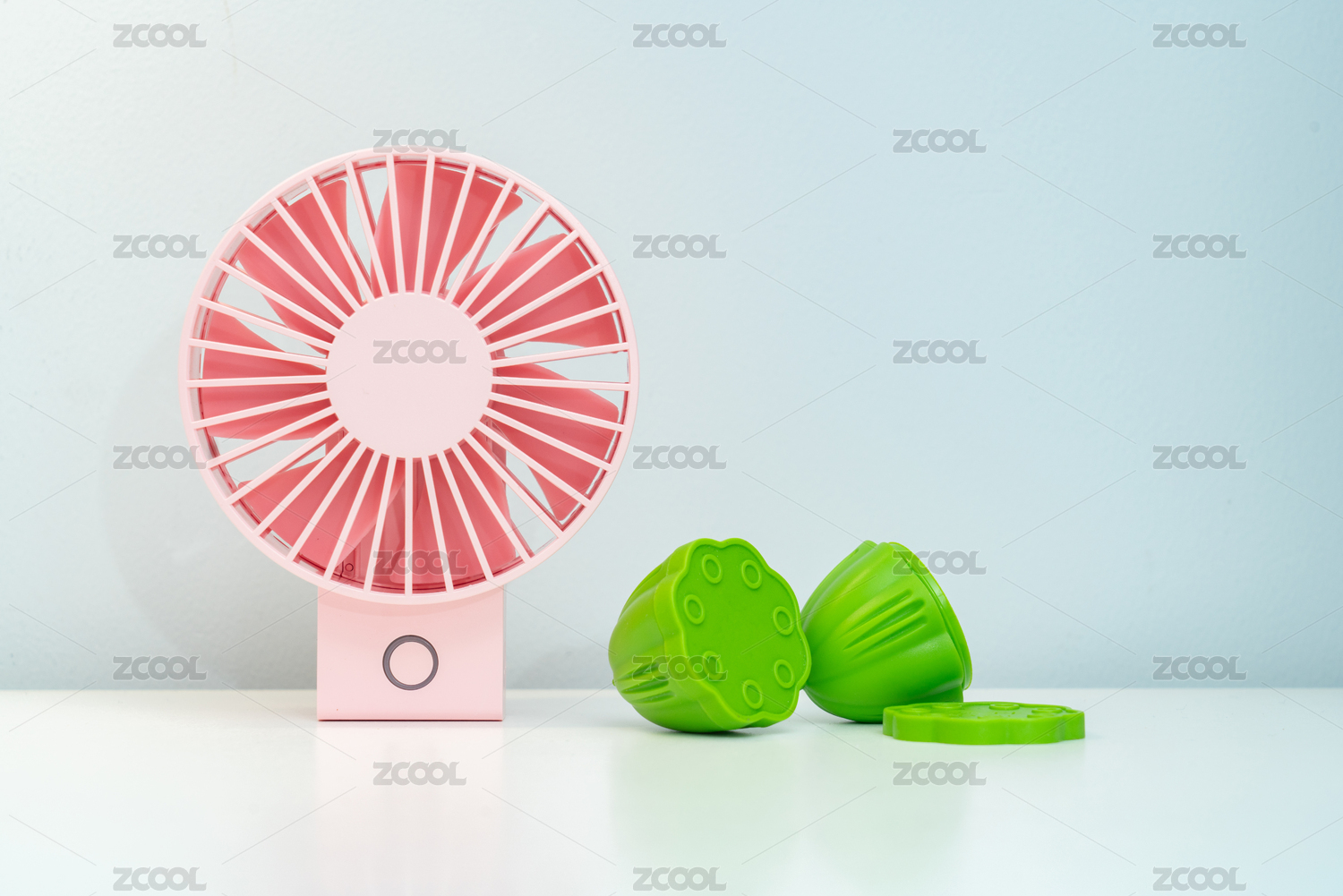 夏天粉紅色的電扇和蓮蓬放在桌面上