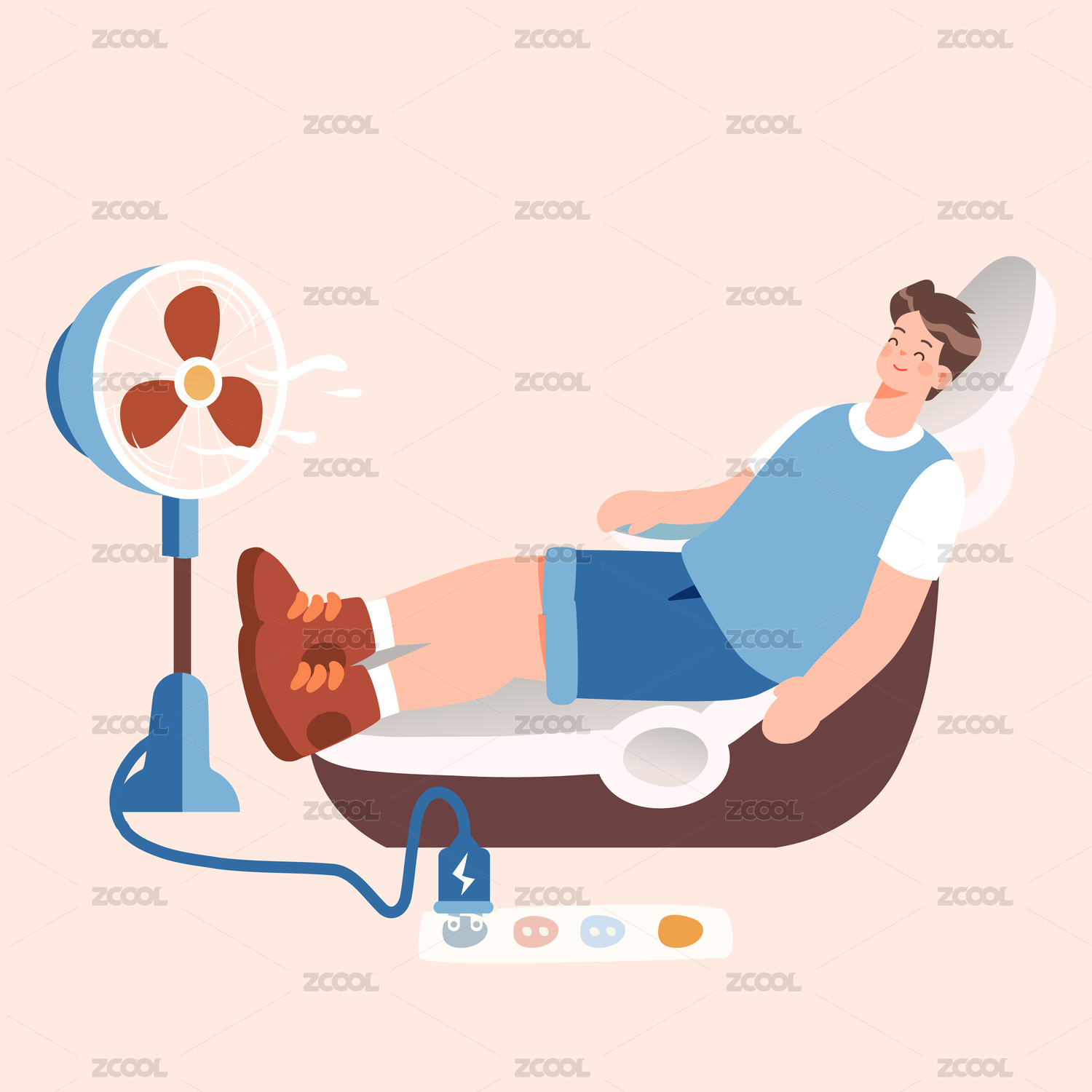 夏季吹電扇的人矢量插畫