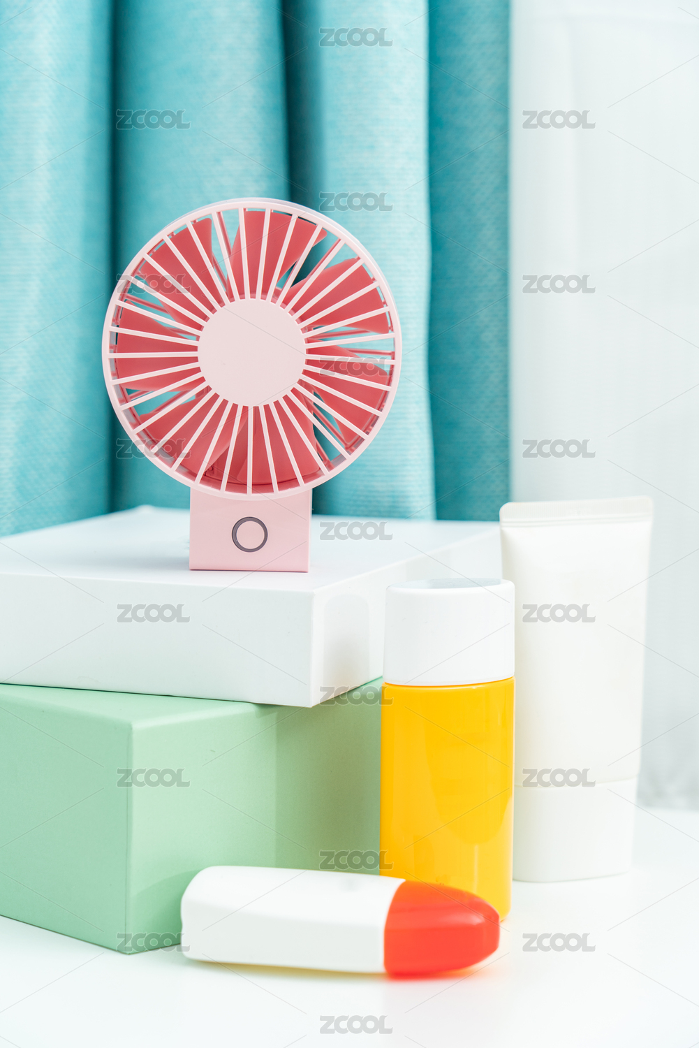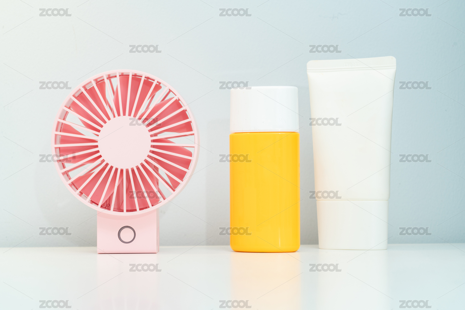粉色的電扇和防曬乳放在白色桌面上