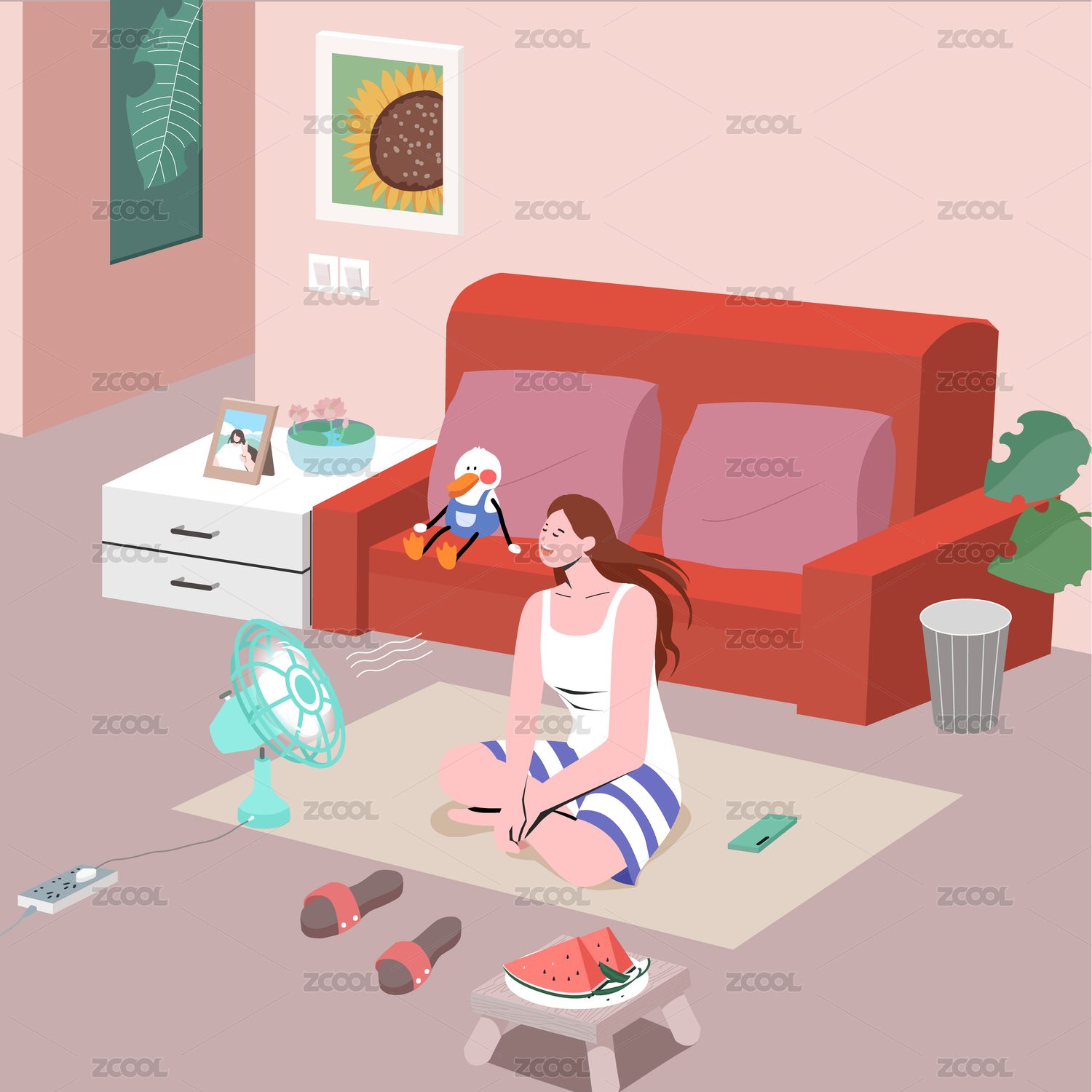 夏日坐在房間里吹電扇的長發(fā)女生