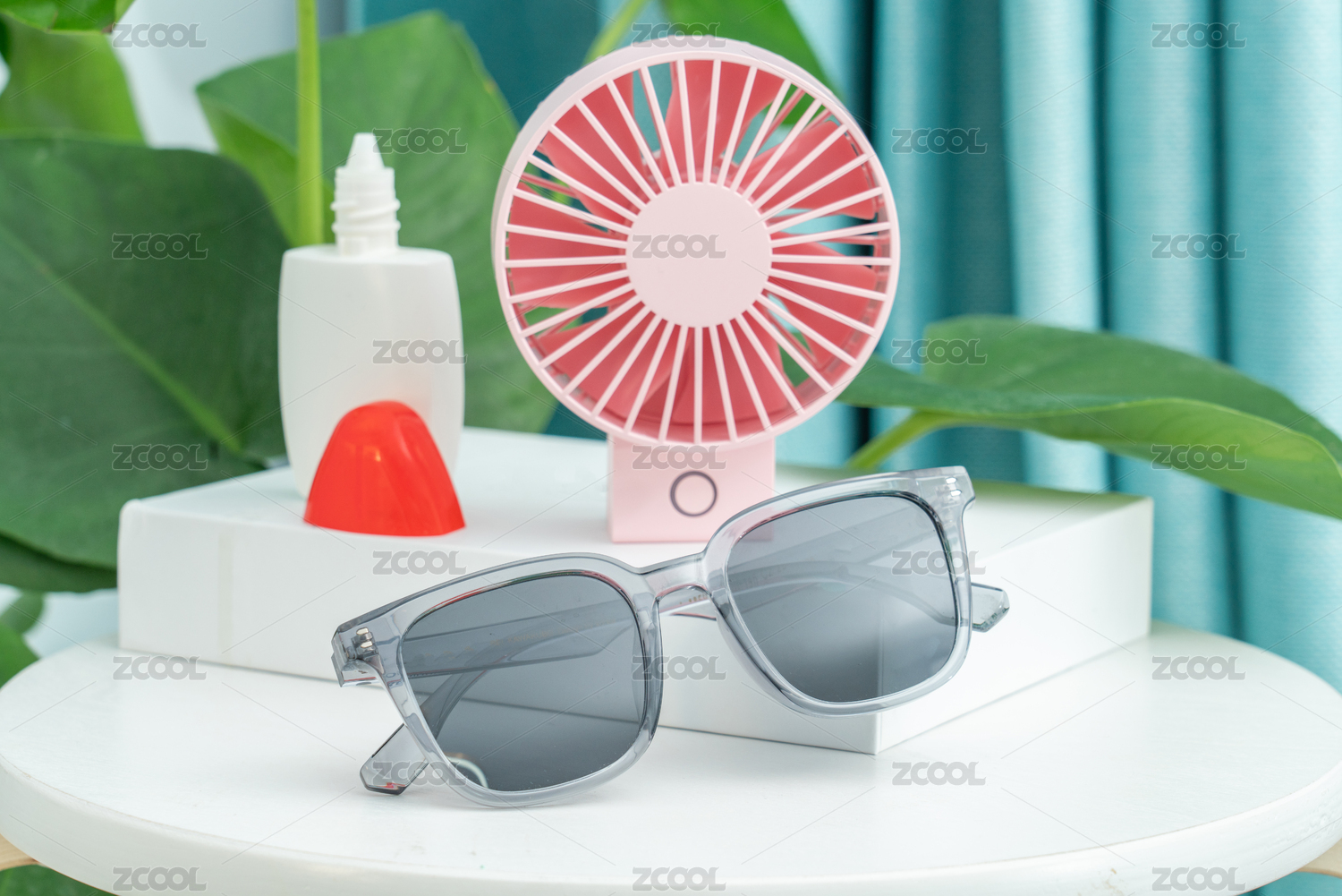 太陽鏡和粉色的小電扇放在臺面上