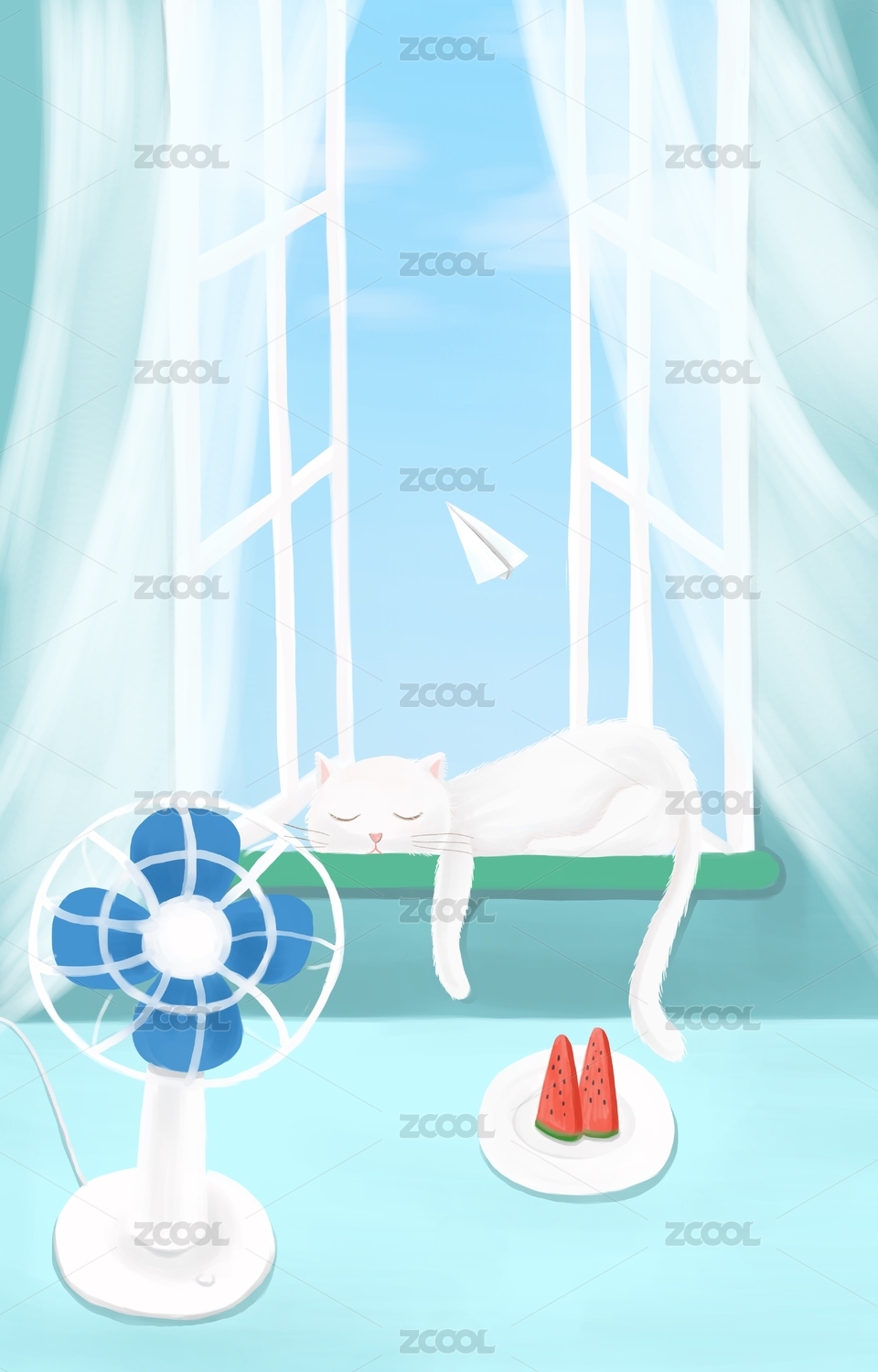夏天炎熱的窗口貓和電扇畢業(yè)季