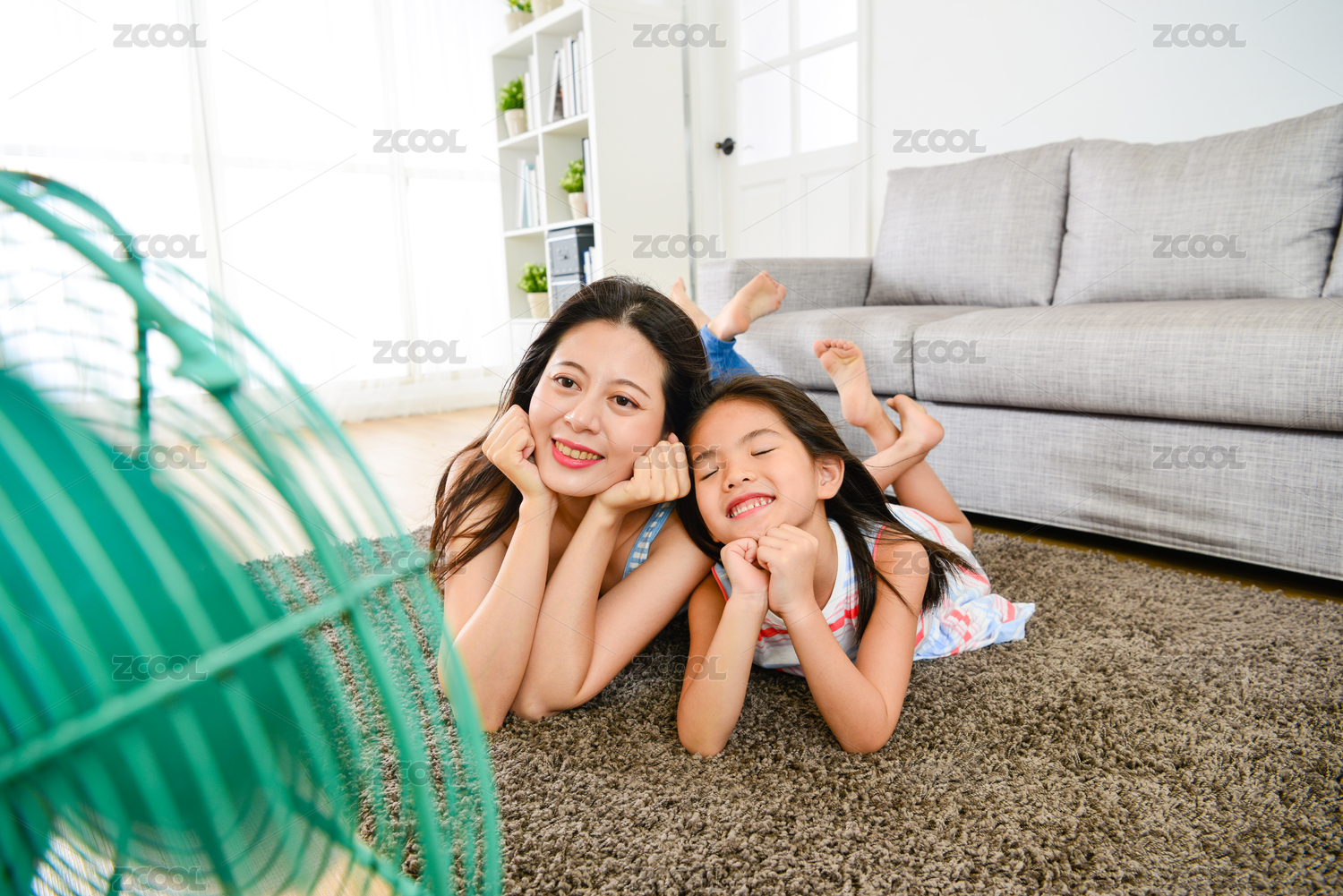 幸福的母親的選擇性的重點照片與小女兒趴倒在客廳的地板上吹電扇,共同享受著涼爽的風(fēng)。