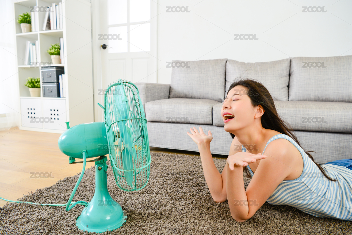快樂有吸引力的女人在家里躺在地板在夏季享受著電扇舒適的冷卻風(fēng)。