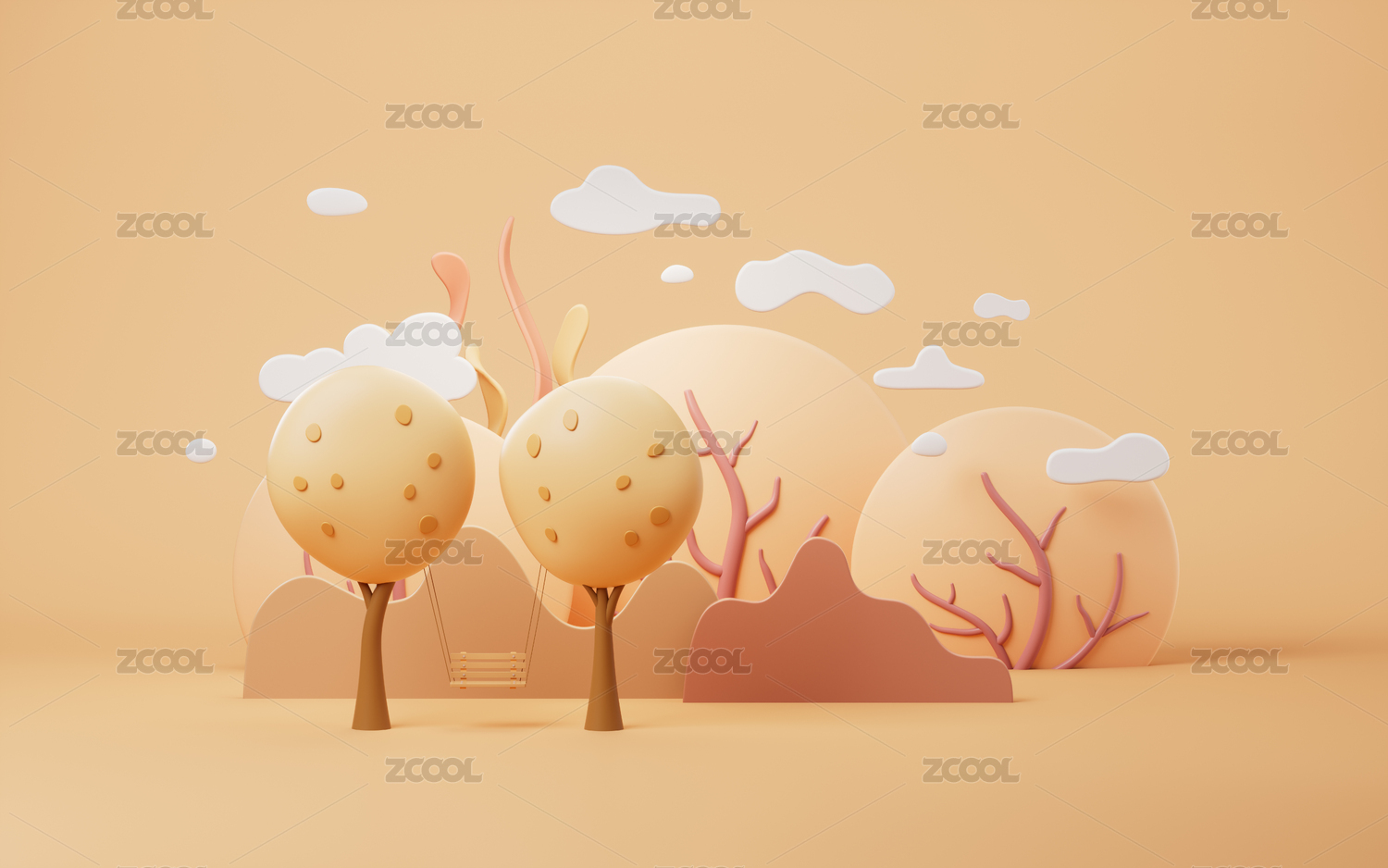 秋天樹木與秋千卡通風(fēng)景3D渲染