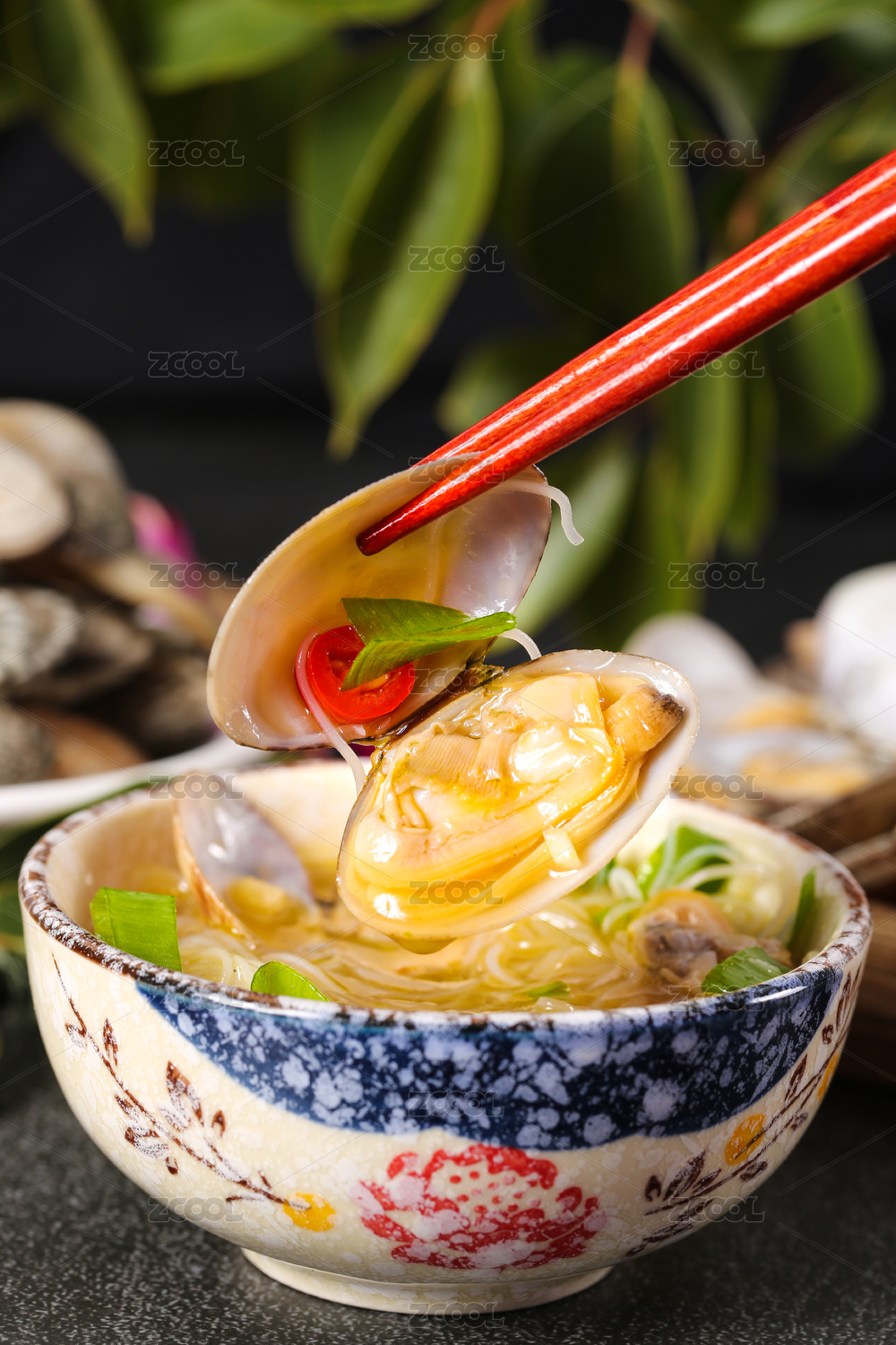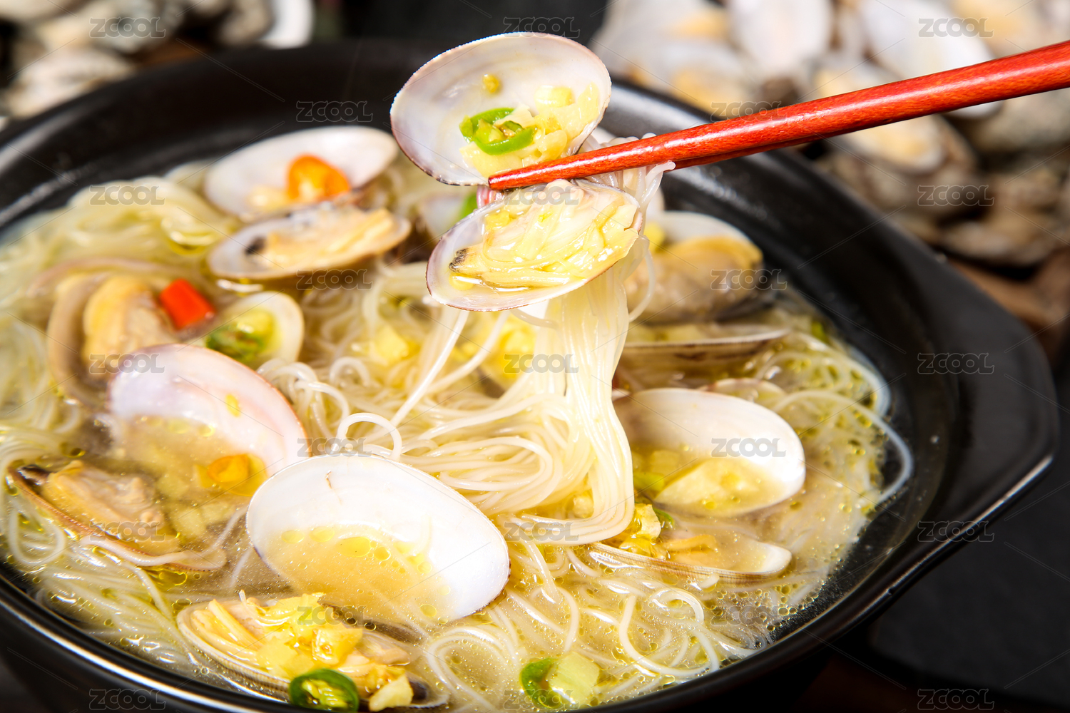 黑底上放著一碗花甲米線砂鍋和筷子夾著花甲