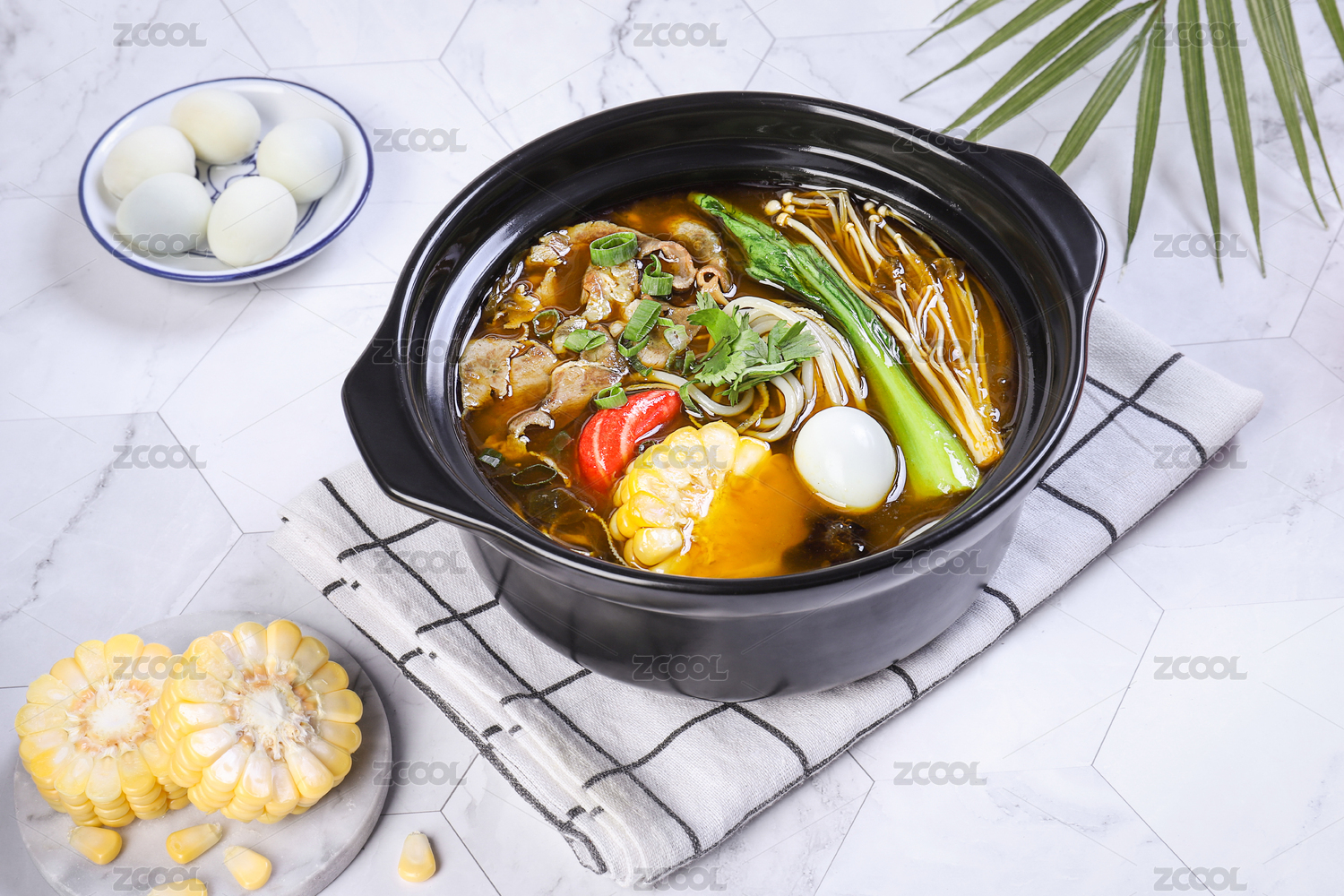 大理石背景上砂鍋里的三鮮米線粉絲