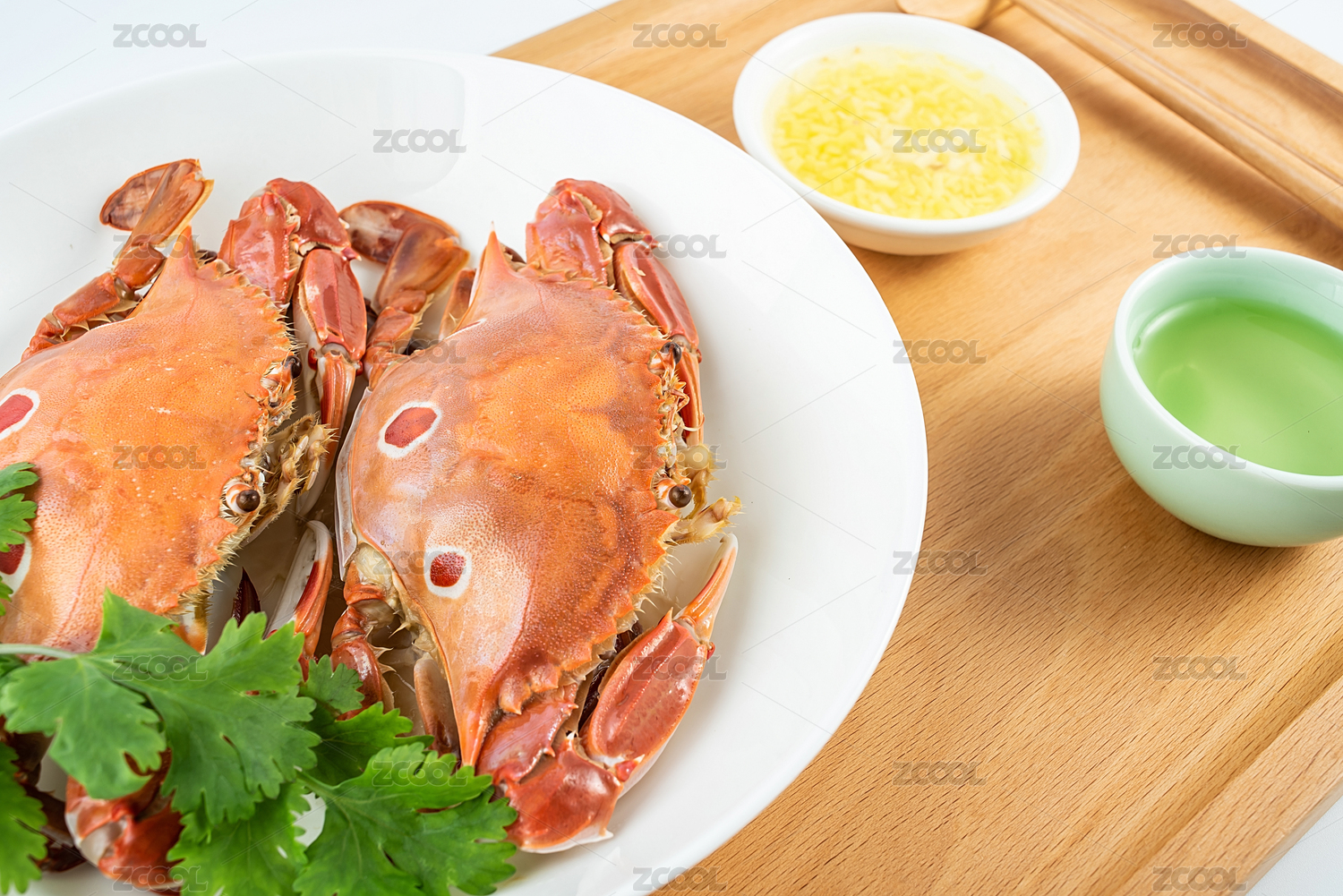 一碟清蒸三點(diǎn)蟹和姜醋醬酒水在木托盤