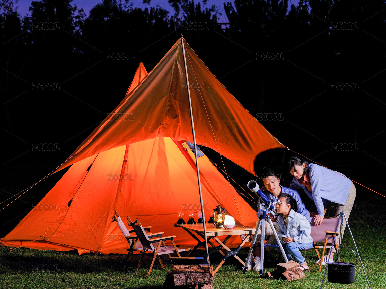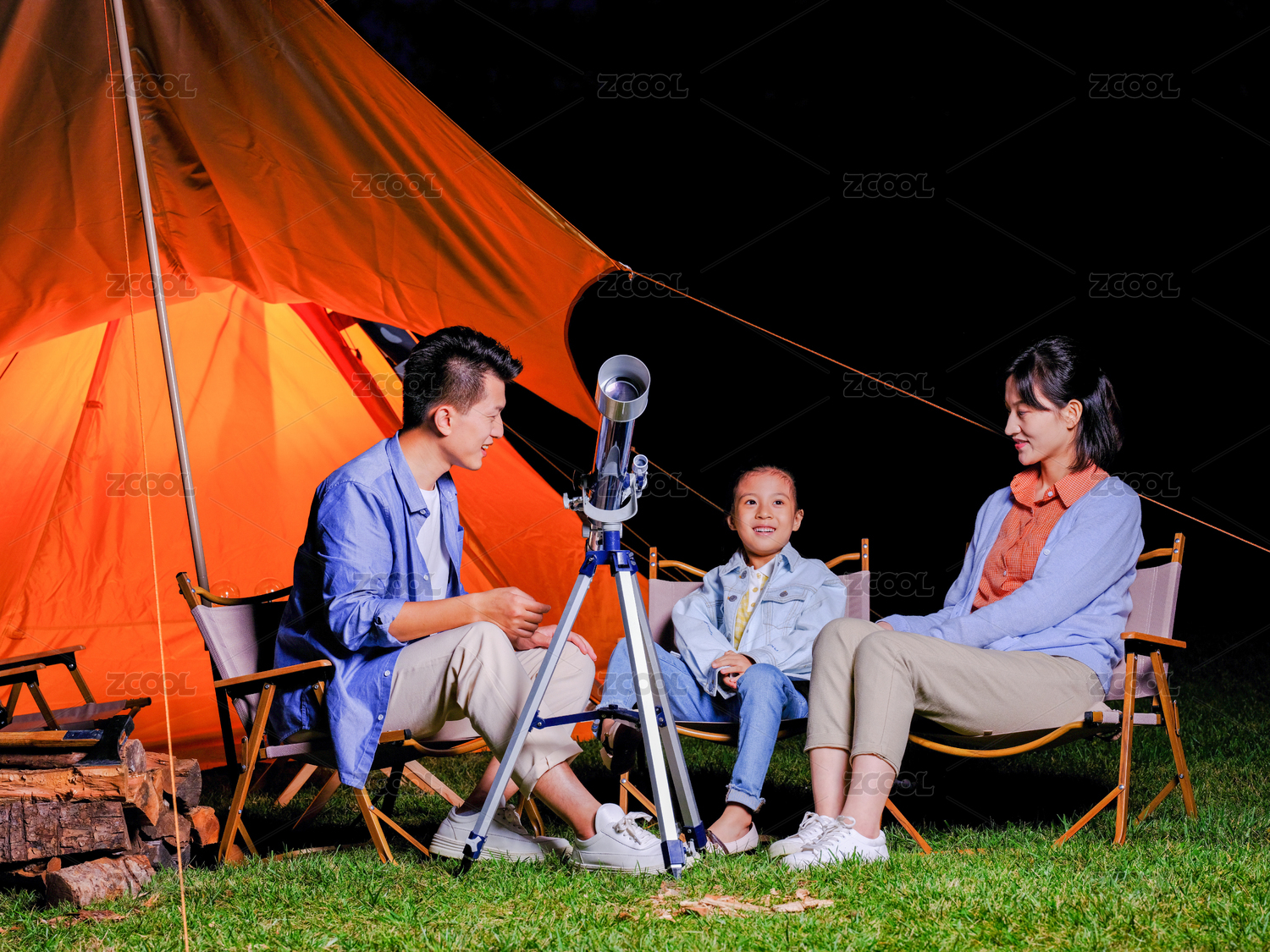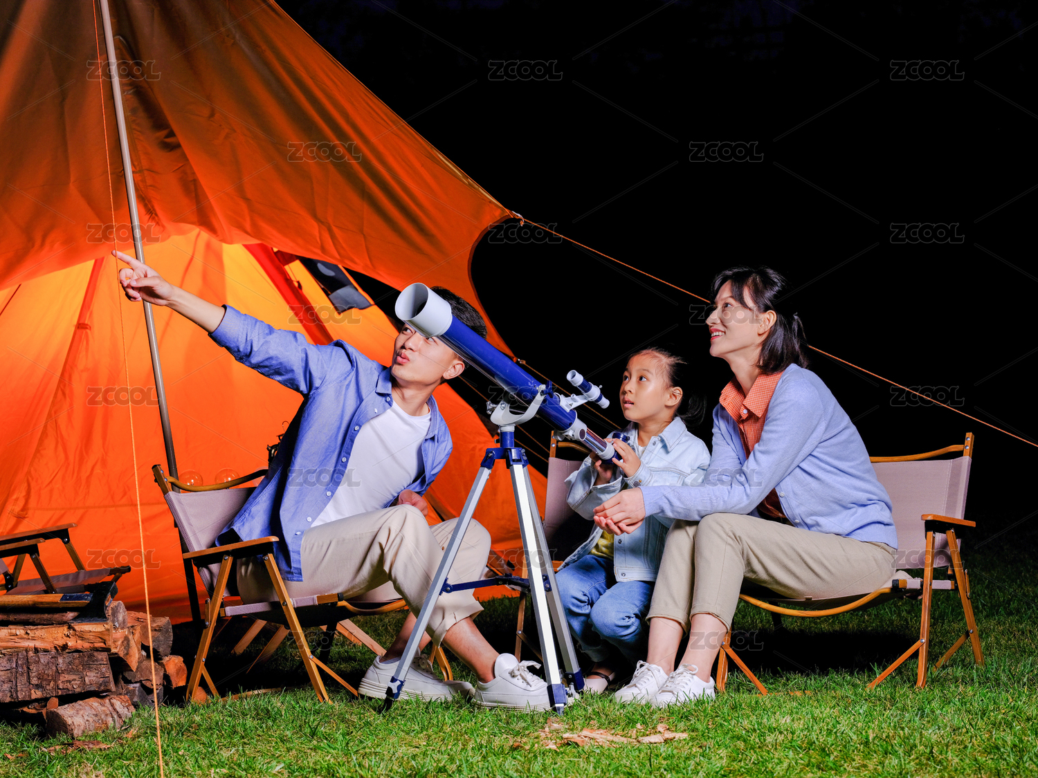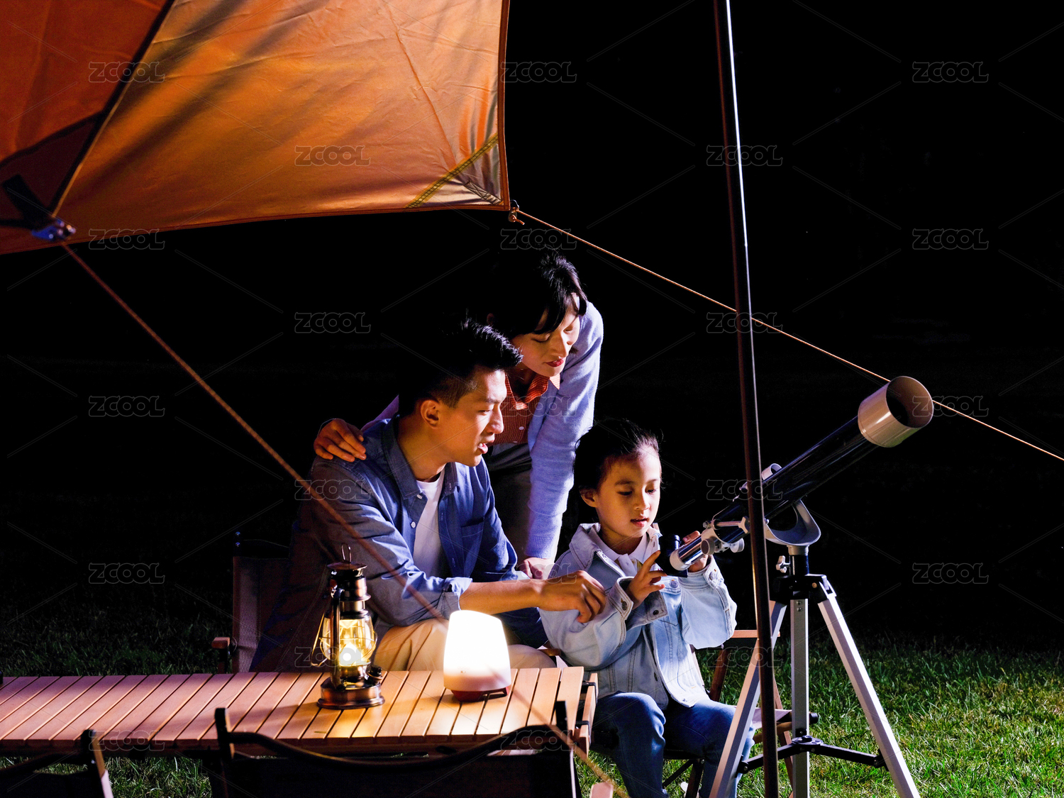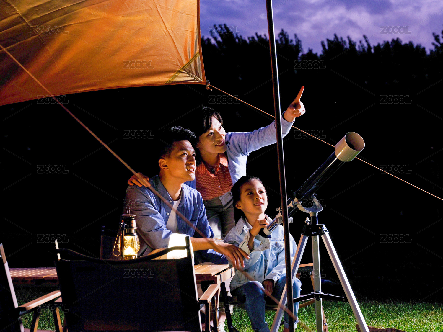 快樂(lè)的三口之家在戶(hù)外使用天文望遠(yuǎn)鏡