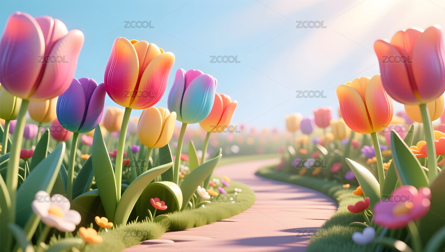 陽光穿透卡通風(fēng)格的五彩郁金香花園