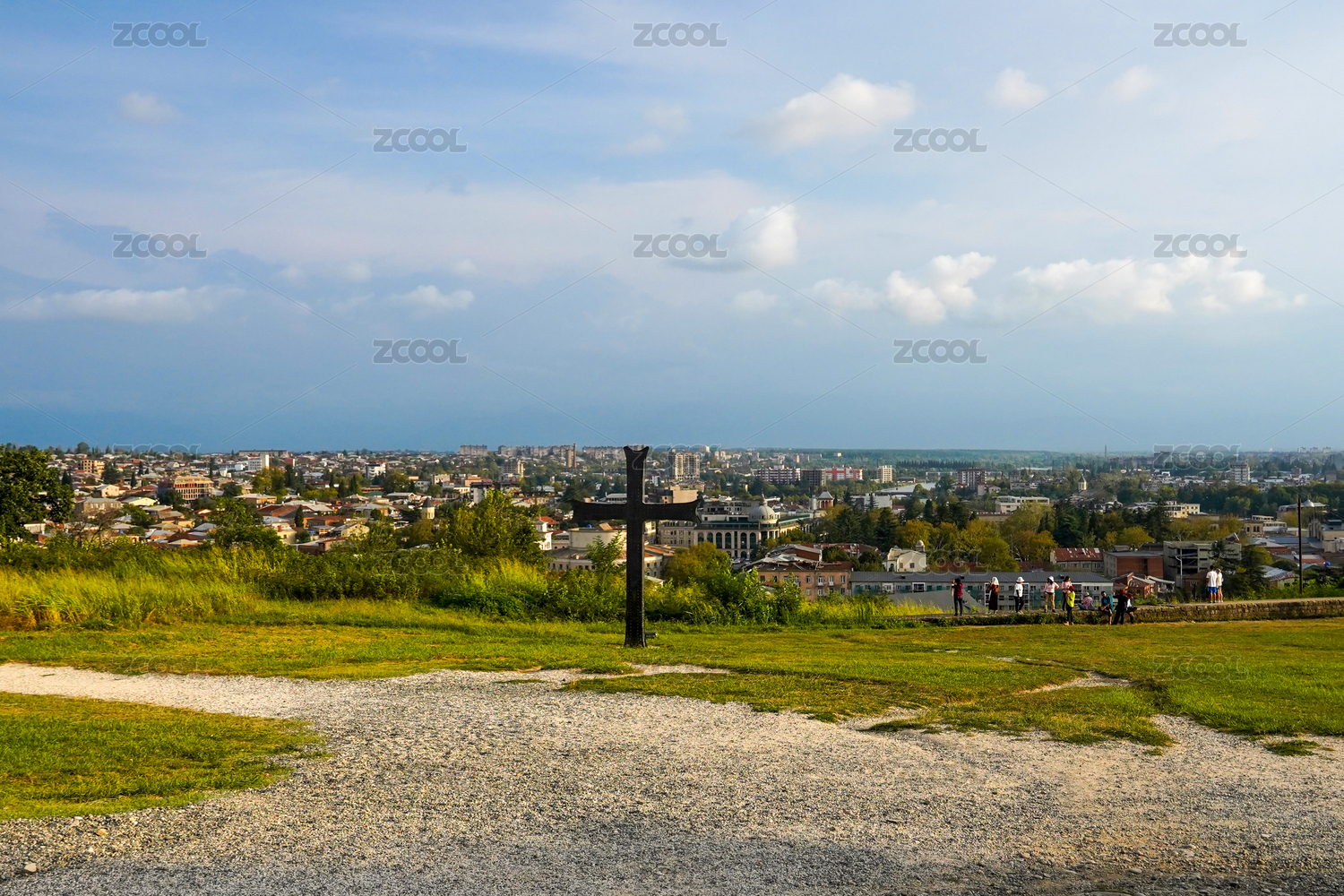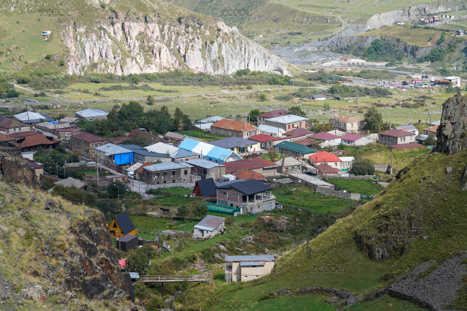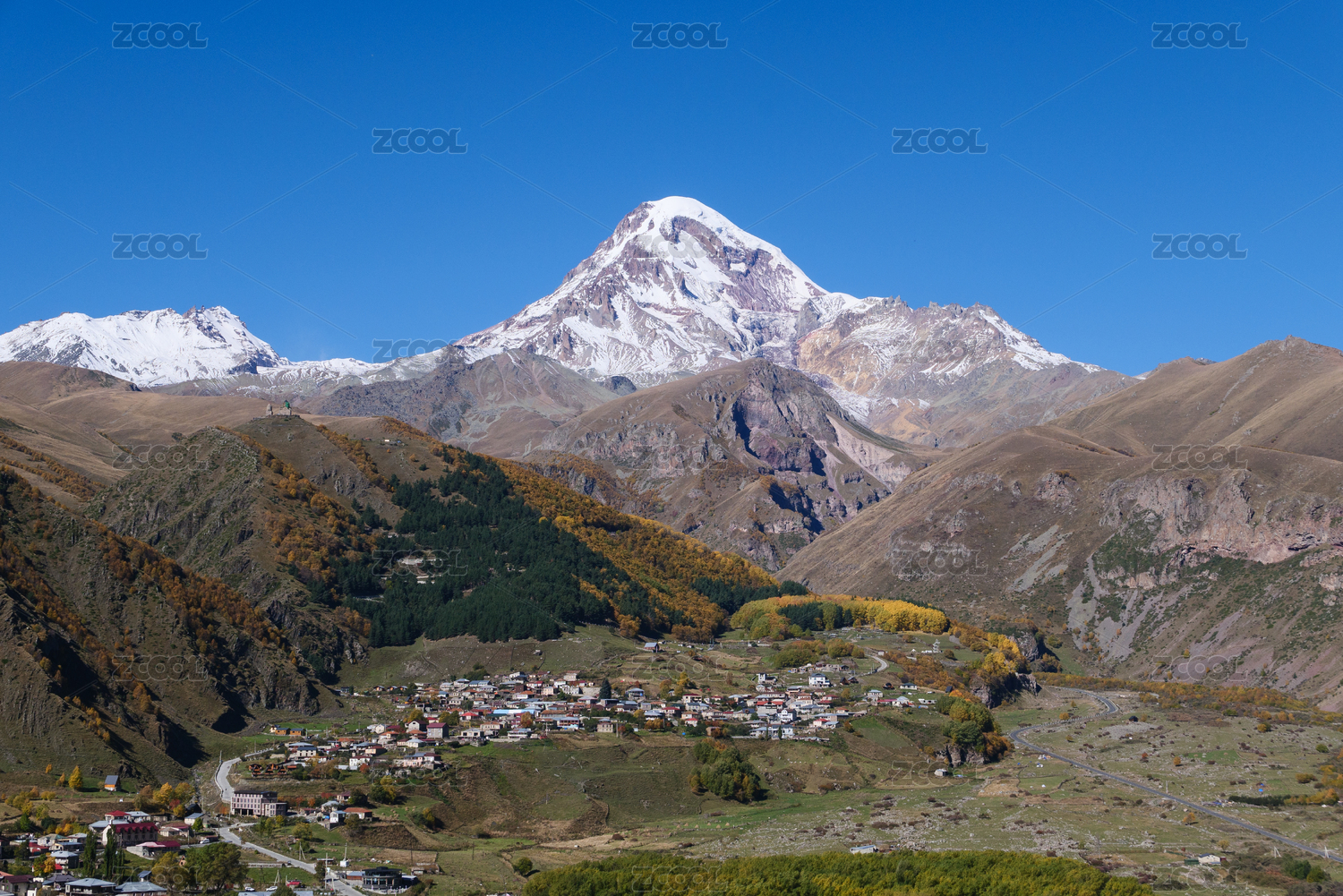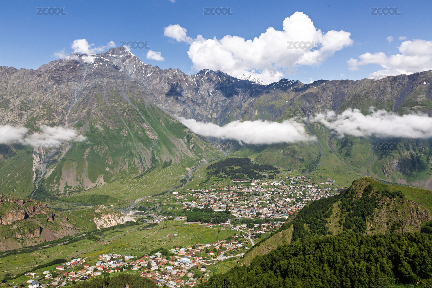藍(lán)天白云下格魯吉亞卡茲別克山地小鎮(zhèn)風(fēng)光