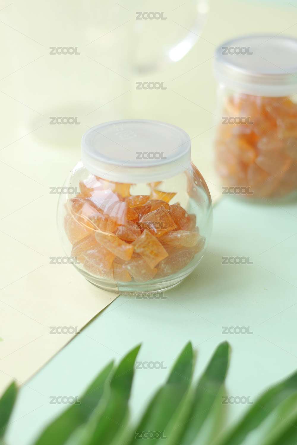 彩色卡紙上用玻璃瓶裝的蜂蜜糖塊