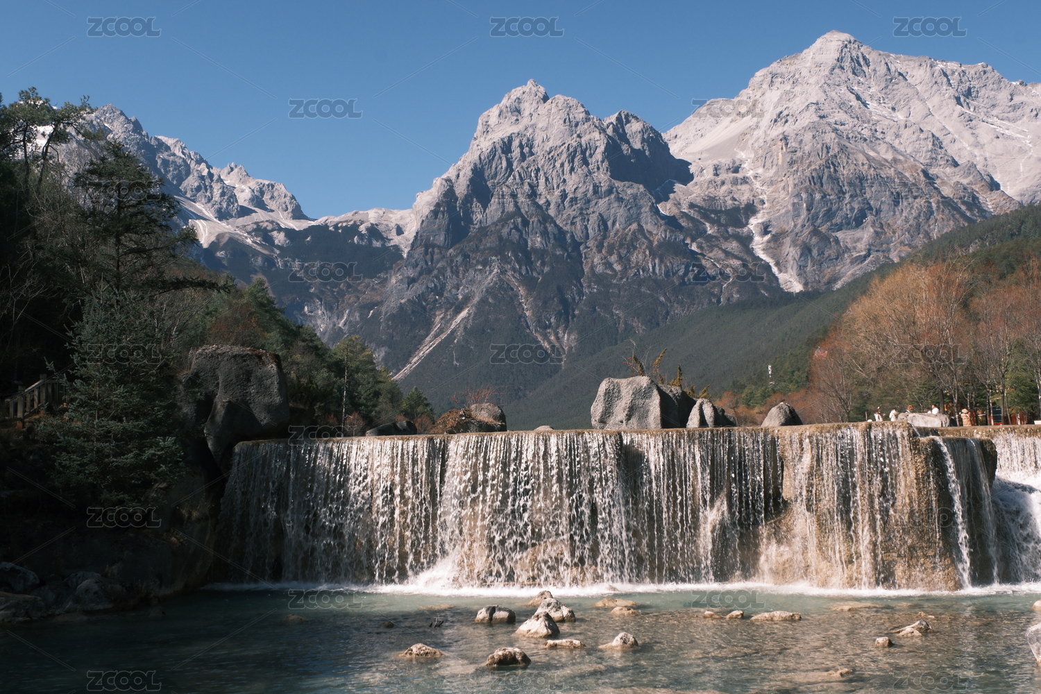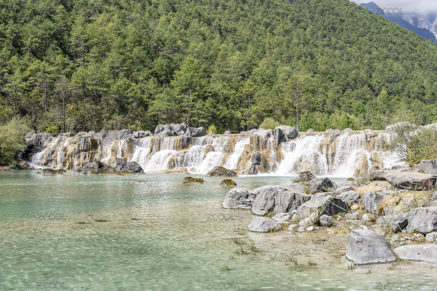 中國云南麗江玉龍雪山藍(lán)月谷瀑布風(fēng)光