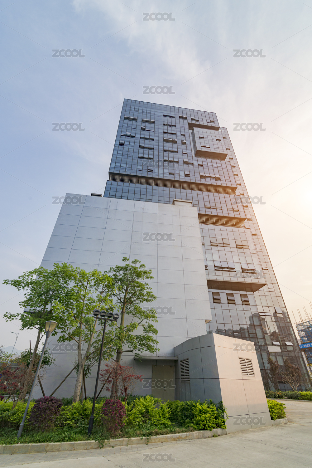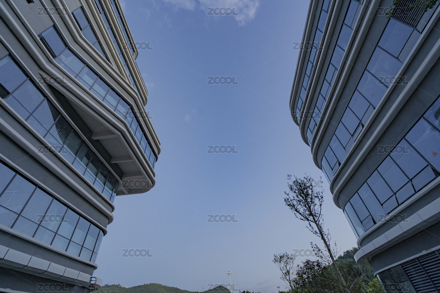 中國(guó)福建龍巖仰拍帶幾何造型的玻璃幕墻建筑